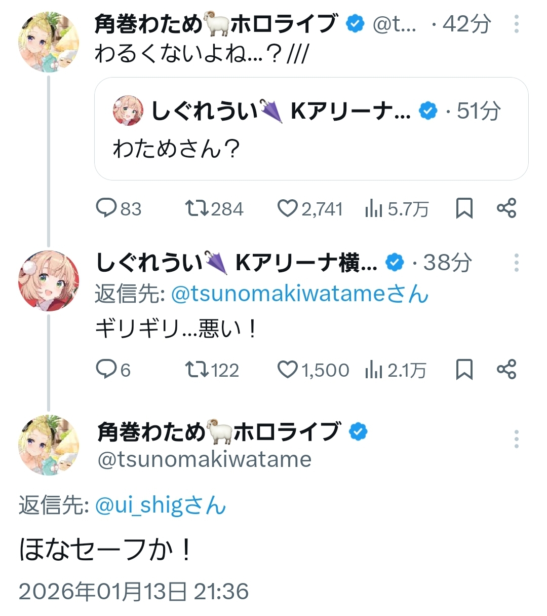 | … | 903無題Name名無し 26/01/13(火)22:33:12 IP:60.137.*(bbtec.net)No.11376767+三期生ライブの一回目はアンコールがなかったからボリューム感少なく感じたから |