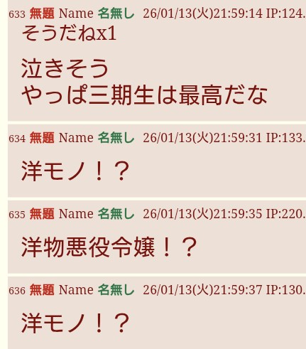 | … | 913無題Name名無し 26/01/13(火)22:34:32 IP:60.69.*(bbtec.net)No.11376777+3連やめろし |