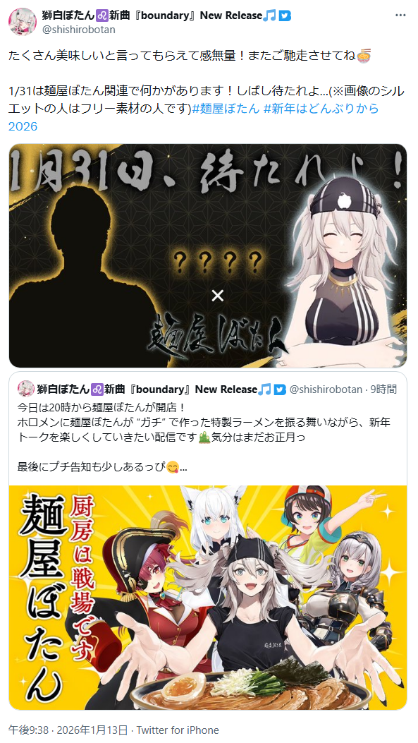 | … | 51無題Name名無し 26/01/13(火)21:01:27 IP:49.105.*(spmode.ne.jp)No.11375888+麺屋ぼたんが1月末にとある人とコラボ |