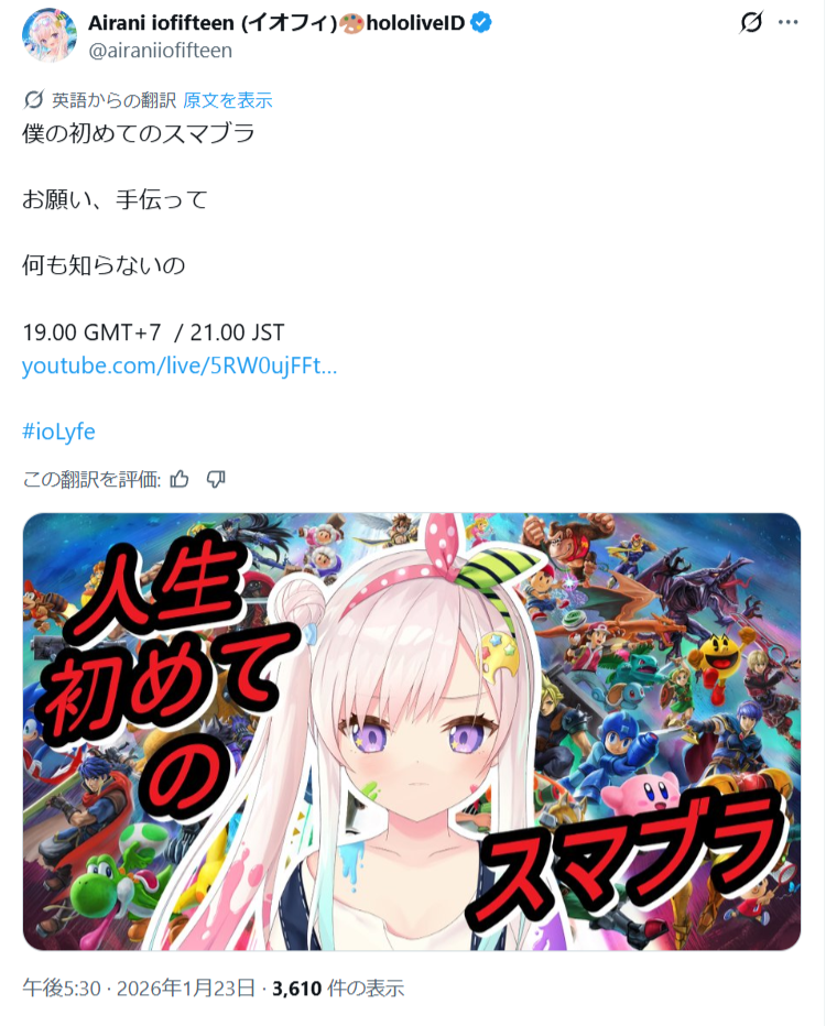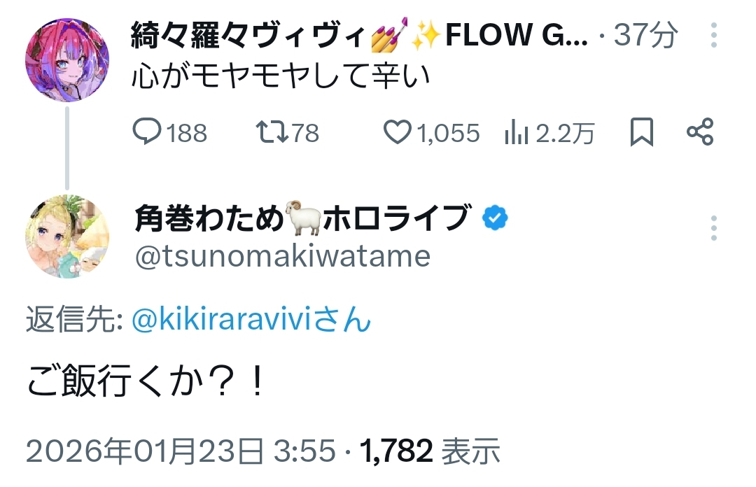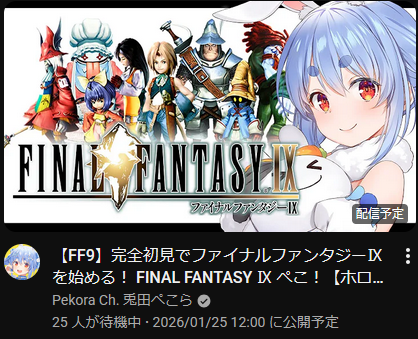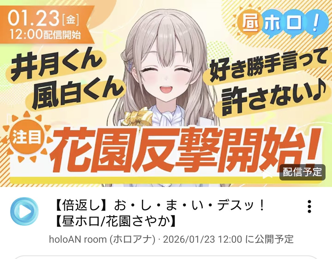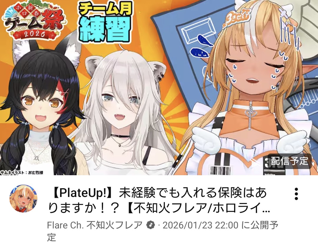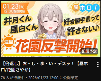 | … | 902無題Name名無し 26/01/23(金)17:39:01 IP:1.75.*(spmode.ne.jp)No.11419394+>配信が無い事と休みはイコールじゃないぞ |