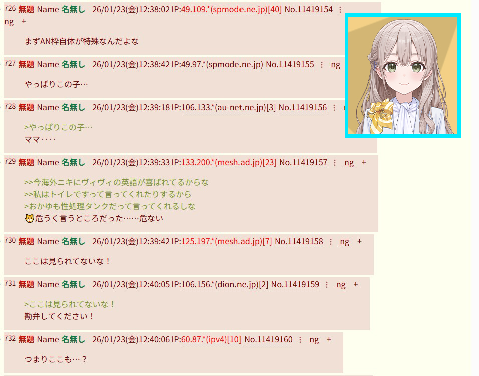 | … | 973無題Name名無し 26/01/23(金)19:14:06 IP:211.7.*(ipv4)No.11419484そうだねx3御当地Vtuberと言う人気やトークスキルや知識全部あってもなれない時はなれないポジション |
