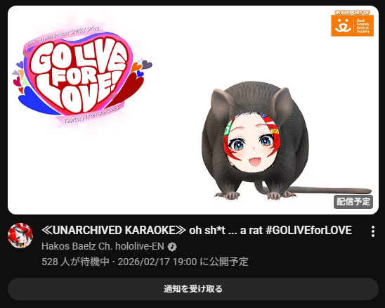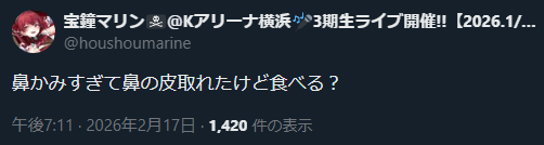 | … | 943無題Name名無し 26/02/17(火)20:25:35 IP:182.249.*(au-net.ne.jp)No.11544032+しかしズズがホロライブのライブに出演する日がくるとは |