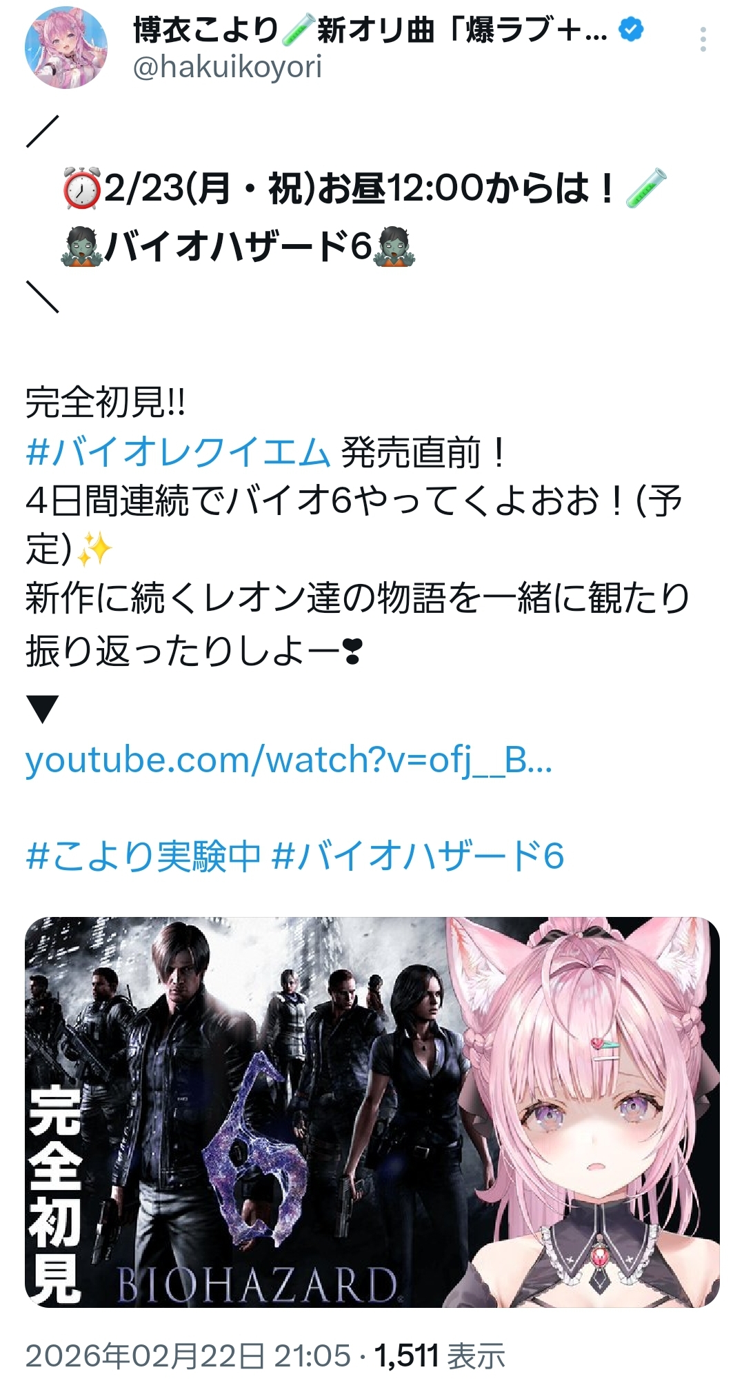 | … | 19無題Name名無し 26/02/22(日)20:44:02 IP:125.194.*(mesh.ad.jp)No.11572032そうだねx2 1771760642382.jpg-(73696 B) こより明日から連続でバイオ6やります |