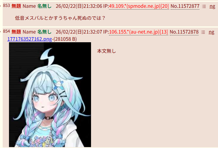 | … | 53無題Name名無し 26/02/22(日)20:50:23 IP:124.159.*(bbiq.jp)No.11572071+FAQ! |