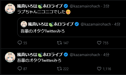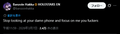 | … | 27無題Name名無し 26/03/08(日)10:05:21 IP:133.200.*(mesh.ad.jp)No.11650132+昨日のミオしゃ凸待ちはホテルに泊まってたメンバーって事か |
