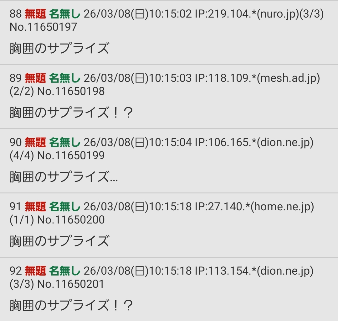 | … | 90無題Name名無し 26/03/08(日)10:15:04 IP:106.165.*(dion.ne.jp)No.11650199+胸囲のサプライズ… |