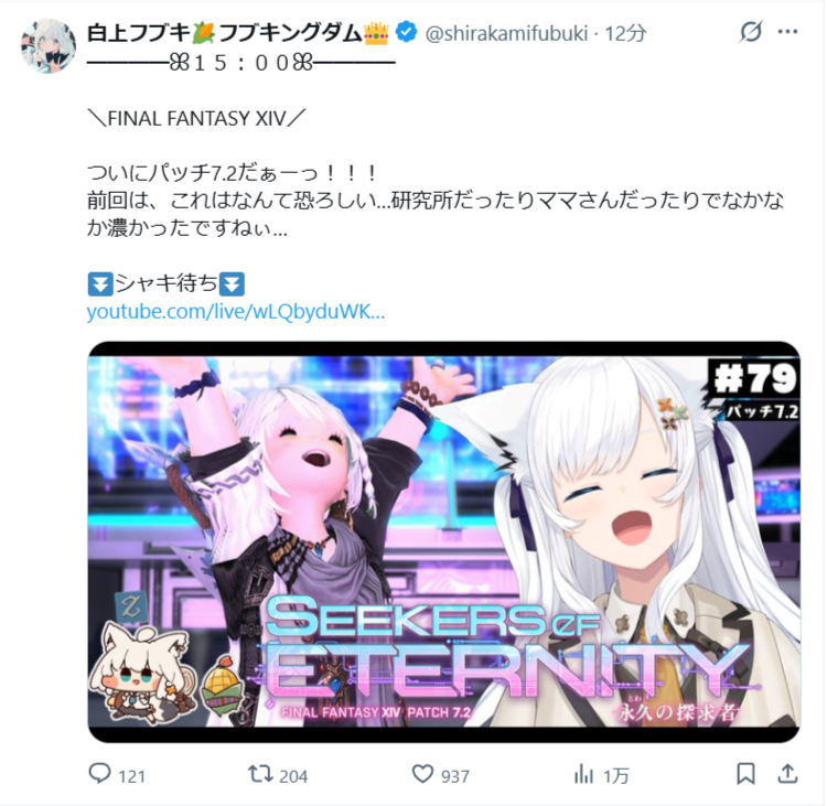 | … | 13無題Name名無し 26/03/22(日)14:39:29 IP:122.133.*(mesh.ad.jp)No.11730821そうだねx2 1774157969267.png-(519225 B) フブさん金コイ前にFF14パッチ7.2です |
