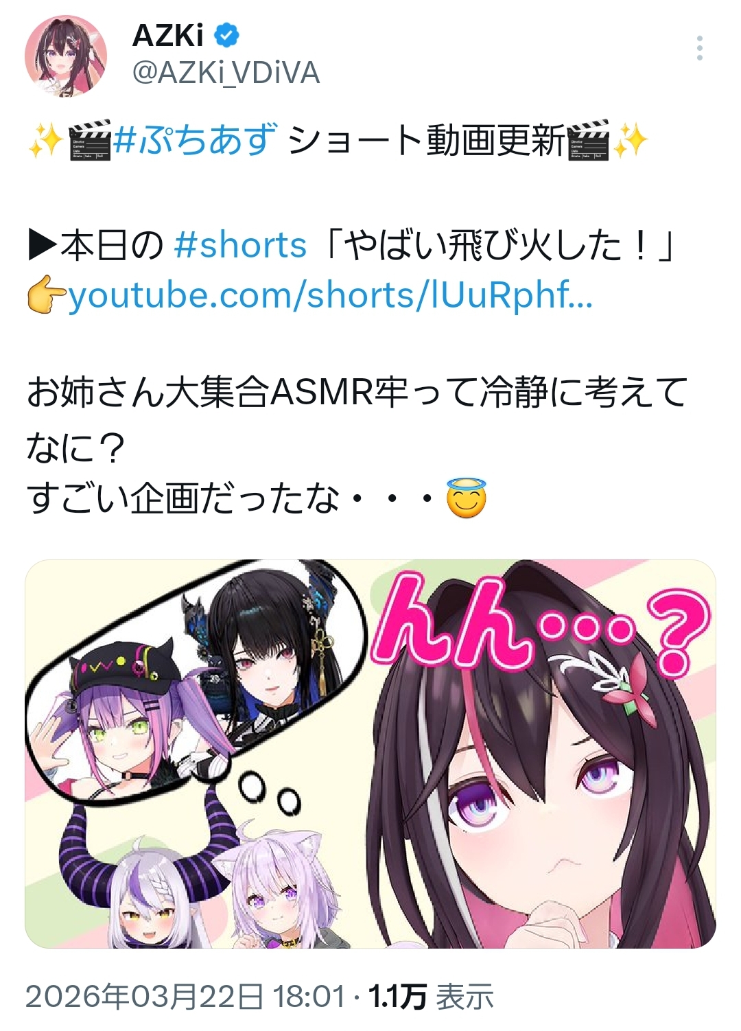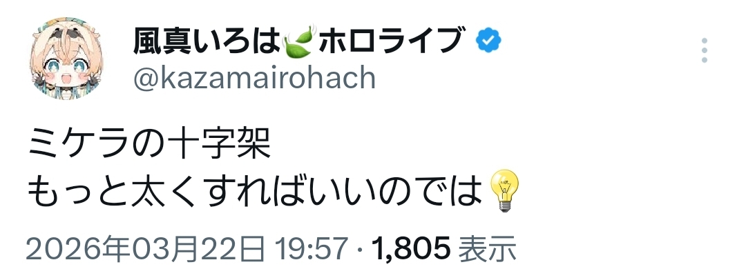 | … | 985無題Name名無し 26/03/22(日)20:30:34 IP:180.197.*(commufa.jp)No.11732888+本当にホロメンの雑談で出てくるかわいい生き物なんです?クールで知的な美女ではないのですか? |