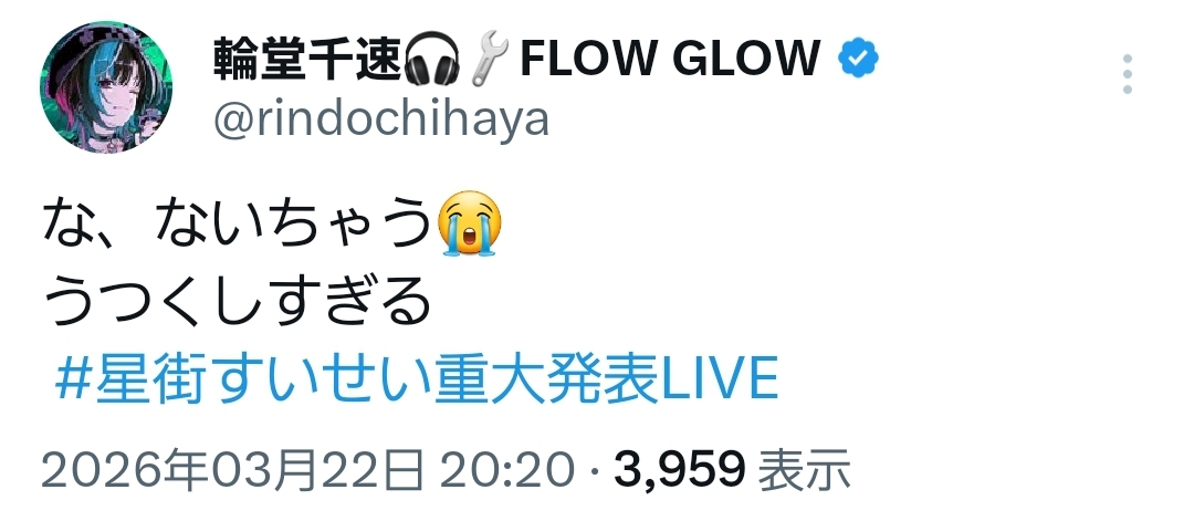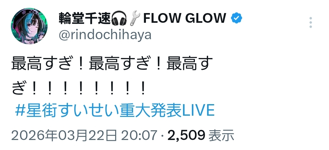 | … | 954無題Name名無し 26/03/22(日)20:28:58 IP:60.56.*(eonet.ne.jp)No.11732857+すいちゃん全部乗せパックみたいなライブだな |