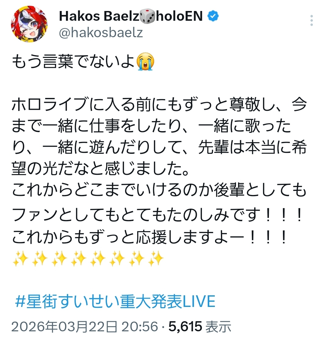 | … | 46無題Name名無し 26/03/22(日)20:52:14 IP:219.67.*(odn.ad.jp)No.11733965そうだねx4そうかこの形式だと歌手星街すいせいとしての仕事はステラ事務所で受けつつホロカやらホロドリみたいなホロライブとしてのIPコンテンツにはすいちゃんとして出れるし引き続きグッズもカバーから出せるんだな |