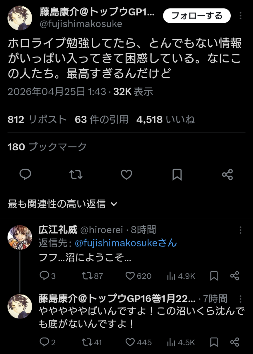 | … | 46無題Name名無し 26/04/25(土)09:40:39 IP:116.65.*(home.ne.jp)No.11915531そうだねx6次は藤島康介先生がホロ沼に落ちたか |