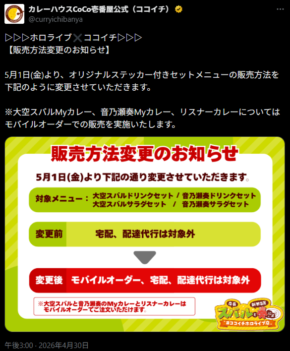| … | 106無題Name名無し 26/04/30(木)15:09:11 IP:130.62.*(transix.jp)No.11940262そうだねx1 1777529351143.png-(173663 B) 明日からのココイチコラボはモバイルオーダー使ってた人注意よー |
