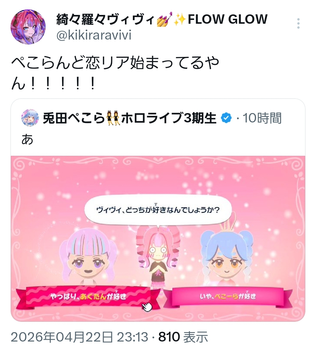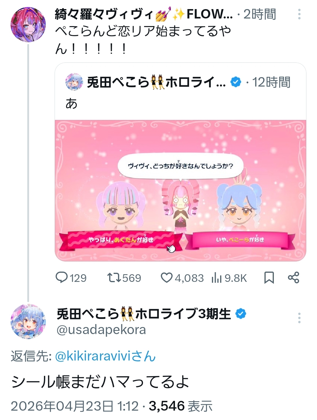 | … | 58無題Name名無し 26/04/22(水)23:13:17 IP:175.177.*(netyou.jp)No.11906595+ヴィヴィに癒されに行くぺこちゃん… |