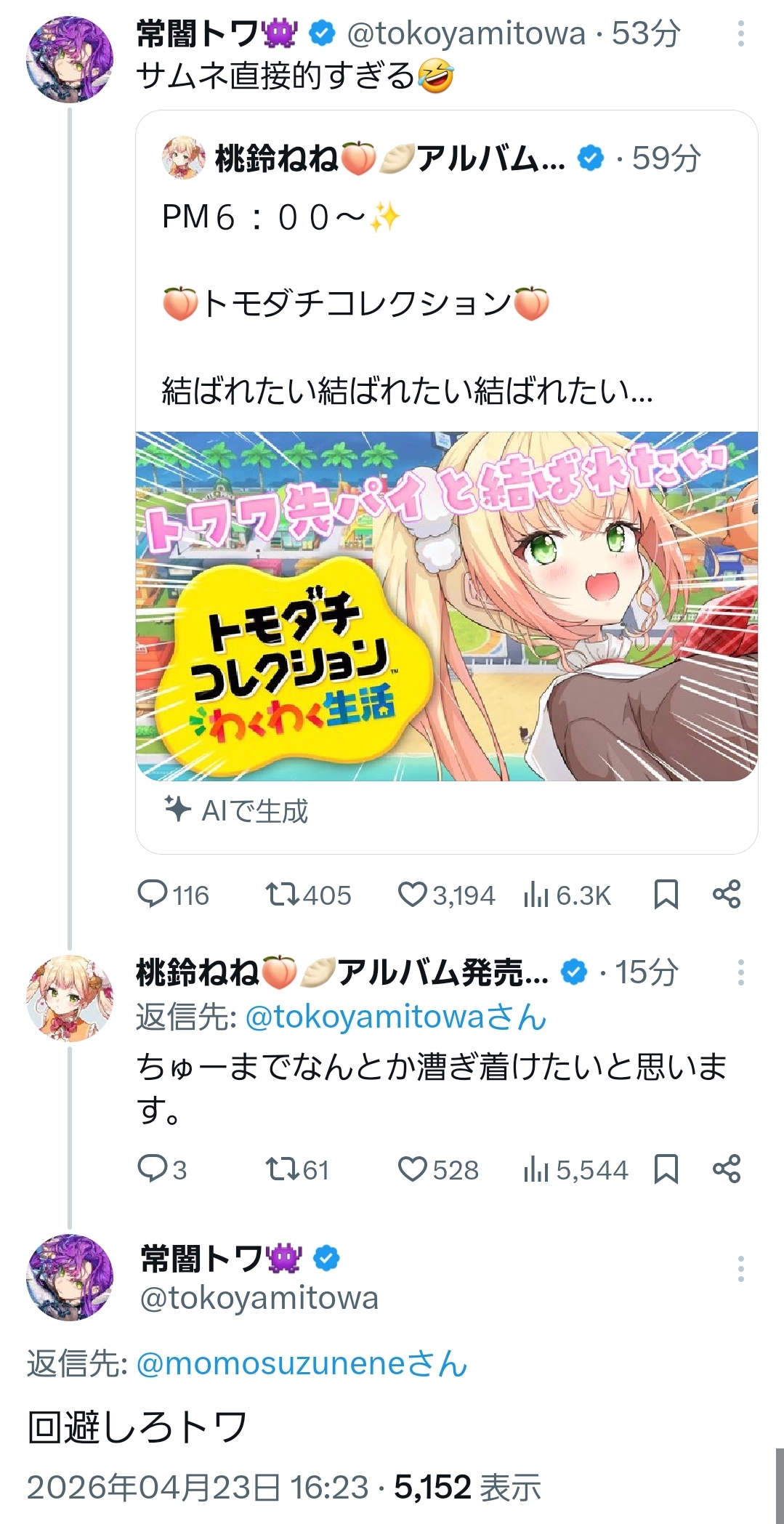 | … | 907無題Name名無し 26/04/23(木)19:31:08 IP:59.146.*(nuro.jp)No.11907633+トワワ先輩は優しいな |