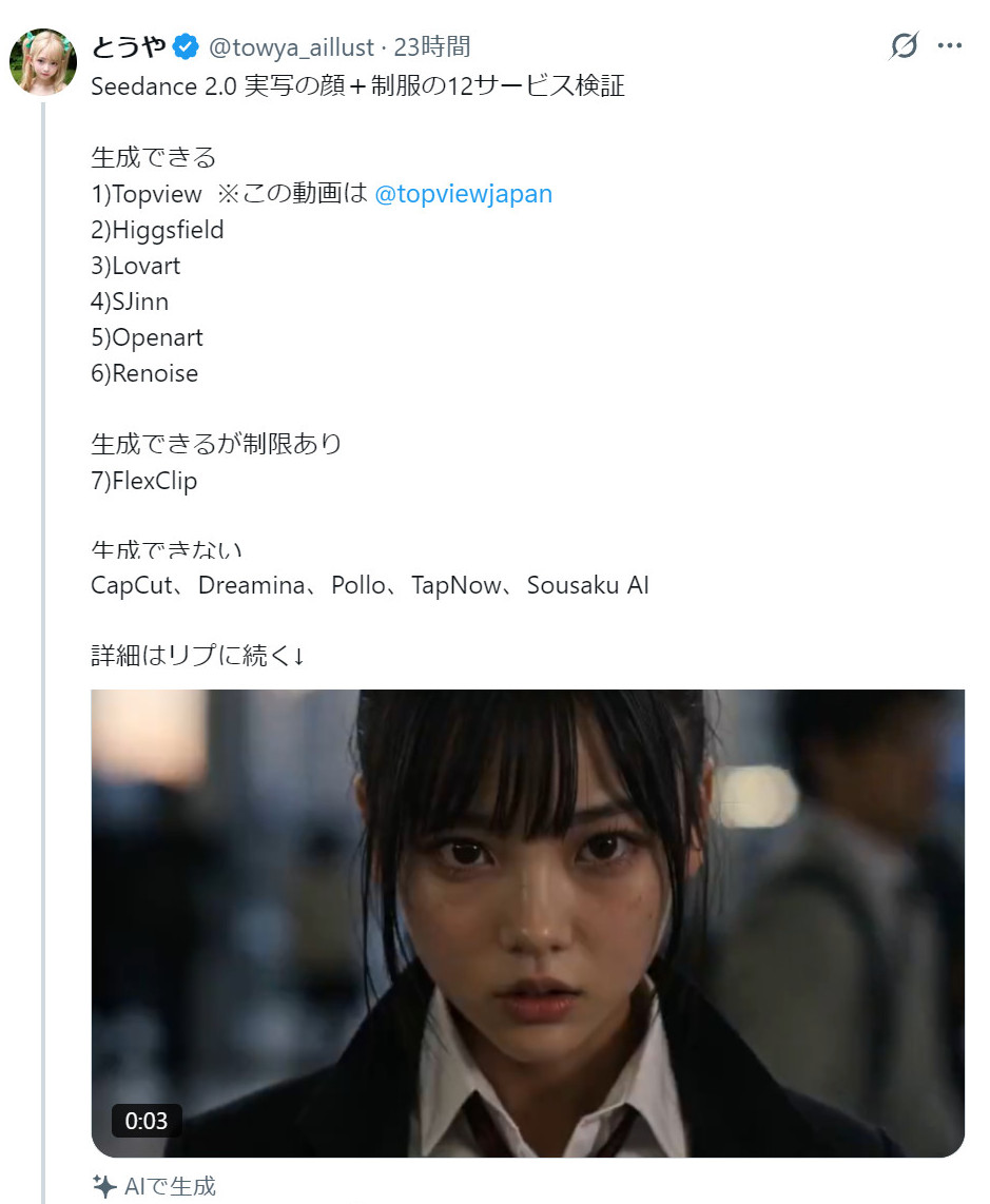 | … | 3無題Name名無し 26/04/13(月)15:13:43No.160219+ 1776060823653.jpg-(264503 B) Seedance2.0が使用可能なサービスの比較 |