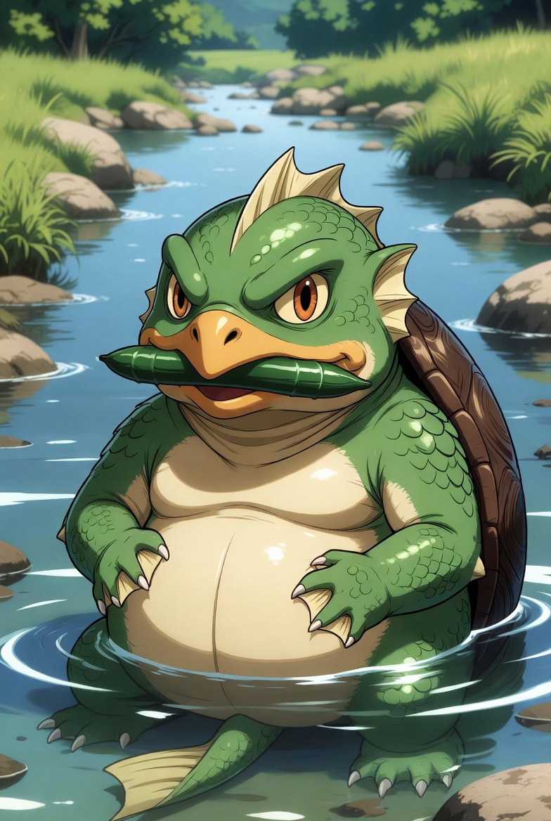 | … | 761無題Name名無し 26/01/31(土)13:44:08No.154394+>「萌えアニメ風。日本の妖怪「河童」の典型的な姿。田舎の清流の川で上半身だけ姿を出してキュウリを口に咥えている。」 |