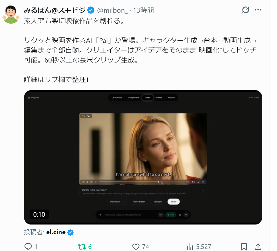 >サクッと映画を作るAI「Pai」が登場。キャラクター生成→台本→動画生成→編集まで全部自動。クリエイターはアイデアをそのまま“映画化”してピッチ可能。60秒以上の長尺クリップ生成。