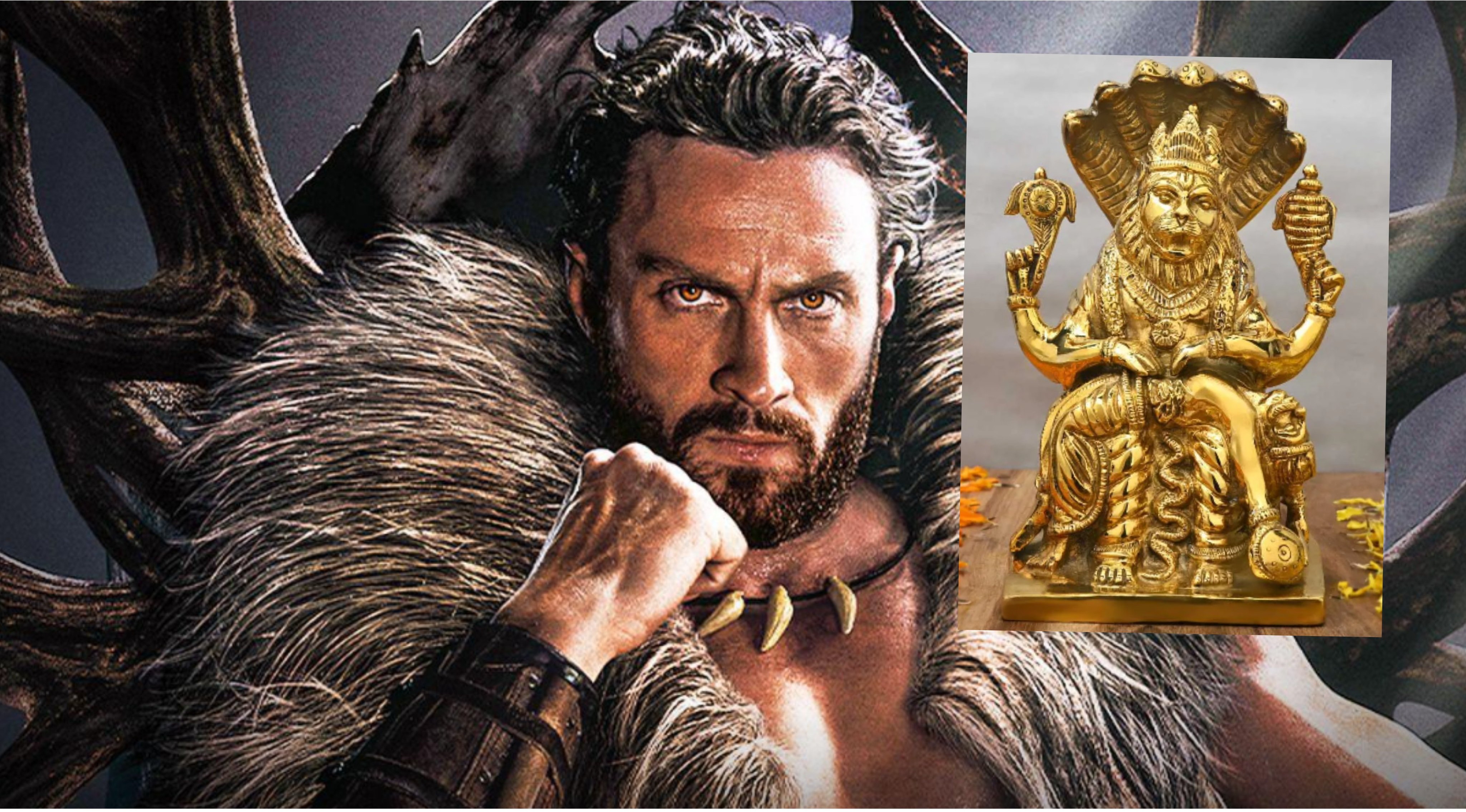 ナラシンハ(Narasiṃha)は、ヒンドゥー教の三大神の1人であるヴィシュヌ神の第4の化身(アヴァターラ)で、獅子の頭と人間の身体を持つ人獅子です。神から「人や獣、昼夜、屋内屋外を問わず殺されない」という祝福を得た魔王ヒラニヤカシプを退治するため、そのいずれでもない存在として夕方に現れ、爪で倒した強力な守護神です。 ナラシンハの神話は、神は真の帰依者を必ず救うことや、絶対的な力を持つ魔王でも「不可能」はないことを示しており、ホーリー祭の起源とも関連している。