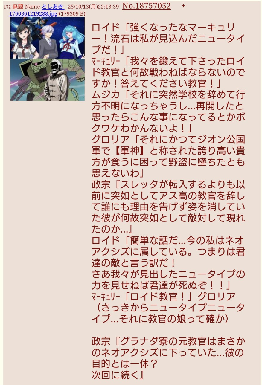… | 72不定期連載『アスティカシア学生会』夏の特別編 幕間CNameとしあき 25/10/18(土)22:58:10No.18761280+ 1760795890109.jpg-(114590 B) ![]() 政宗『時間は前回ラストより少しばかりさかのぼる・・・ここは地球連邦軍の某基地』 |
