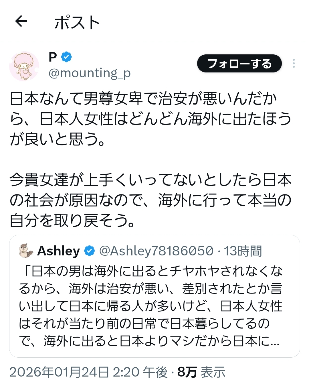 日本なんて男尊女卑で治安が悪いんだから、日本人女性はどんどん海外に出たほうが良いと思う。今貴女達が上手くいってないとしたら日本の社会が原因なので、海外に行って本当の自分を取り戻そう。