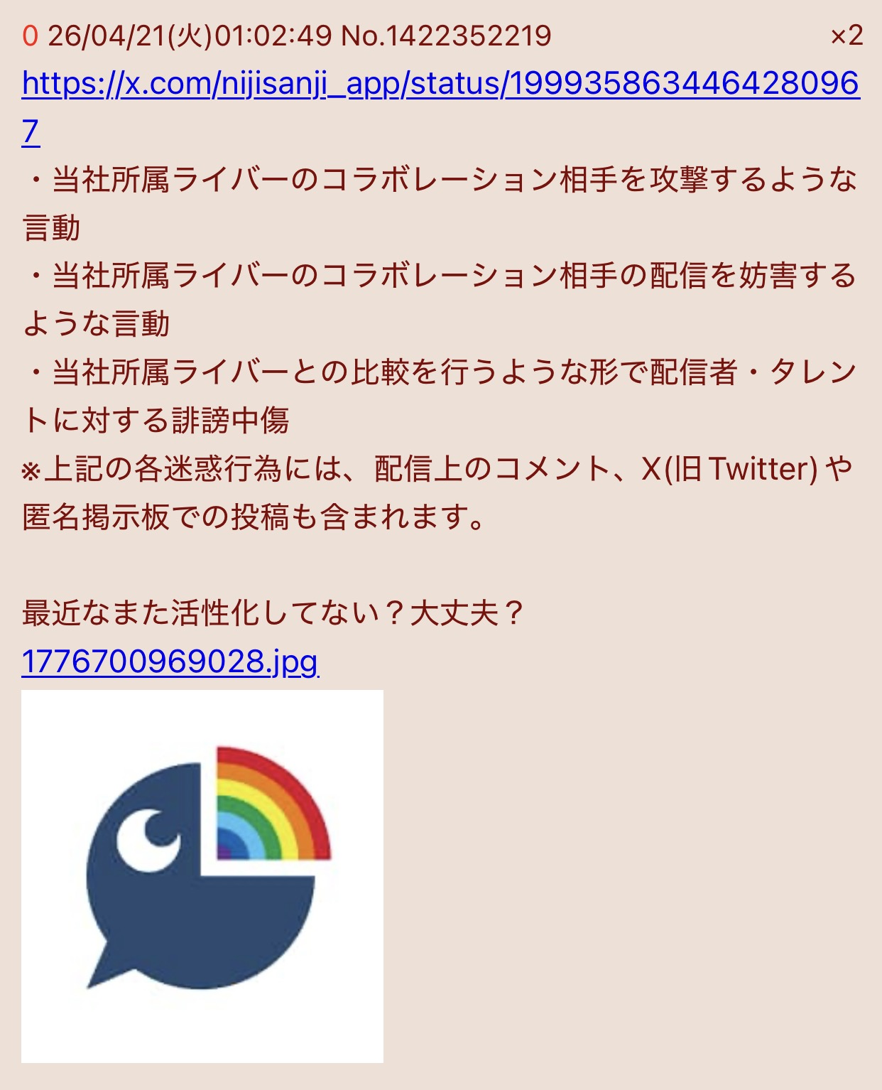 | D | fu6574429.jpeg | 0d10229efc4473170c721cbc50e3e628 | 251 | 26/04/20(月)16:55 |