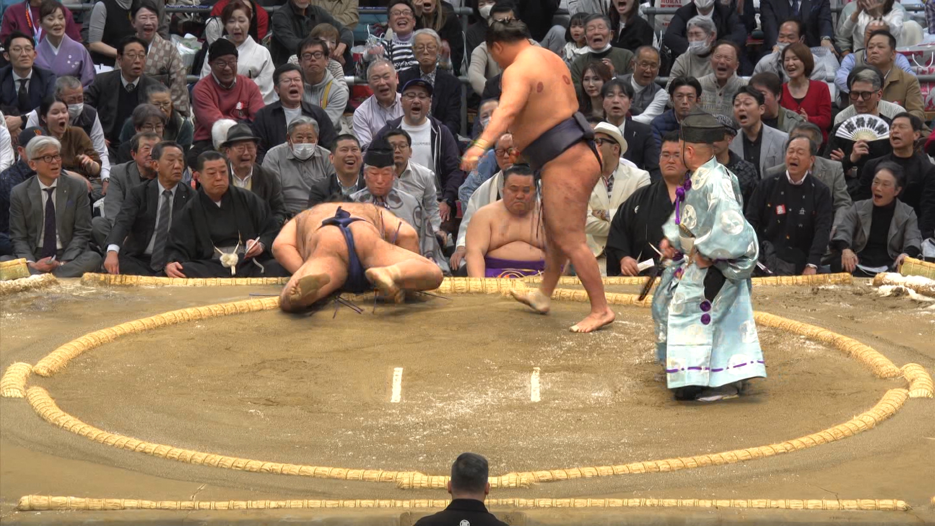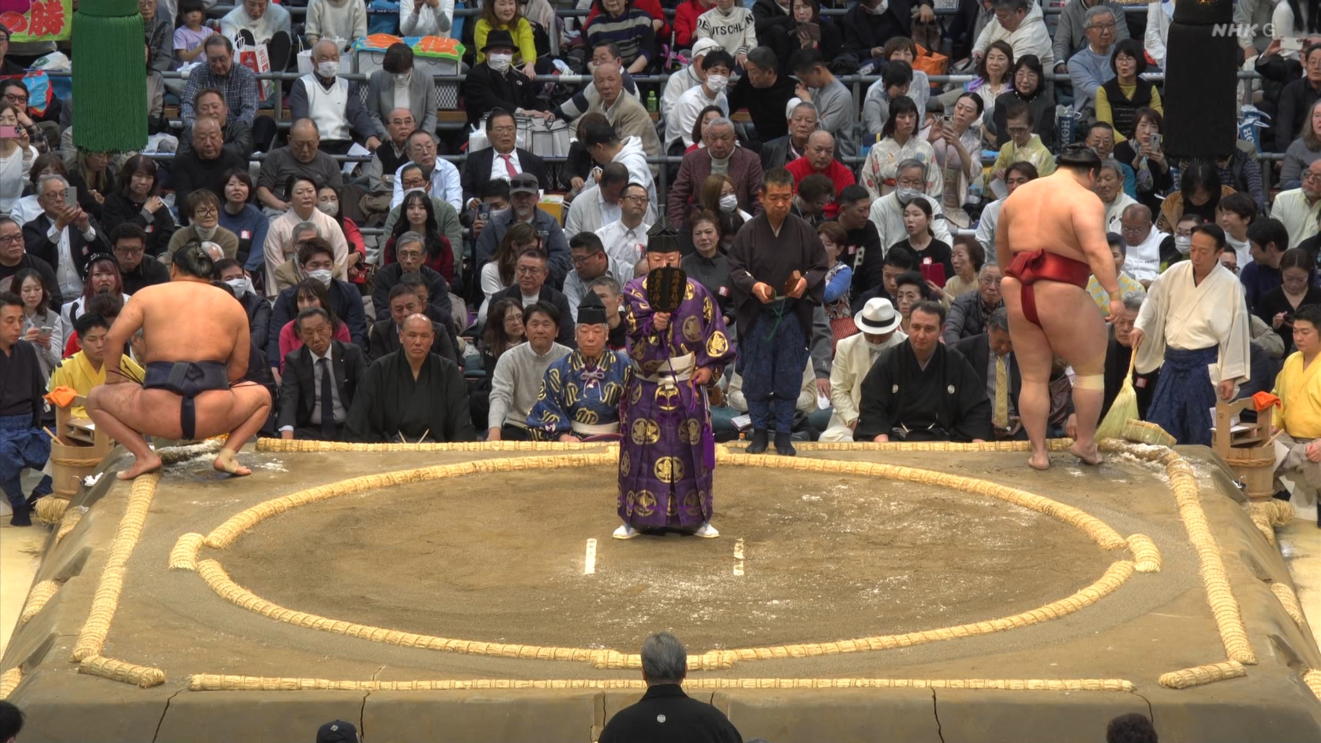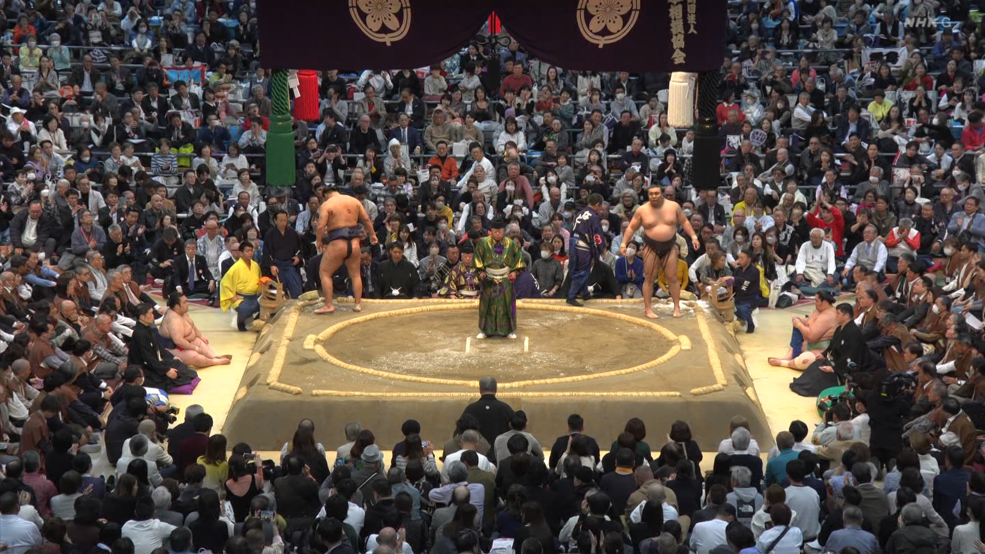 【解説】正面 琴風 浩一〔元大関〕、向正面 立浪親方〔元小結 旭豊関〕
