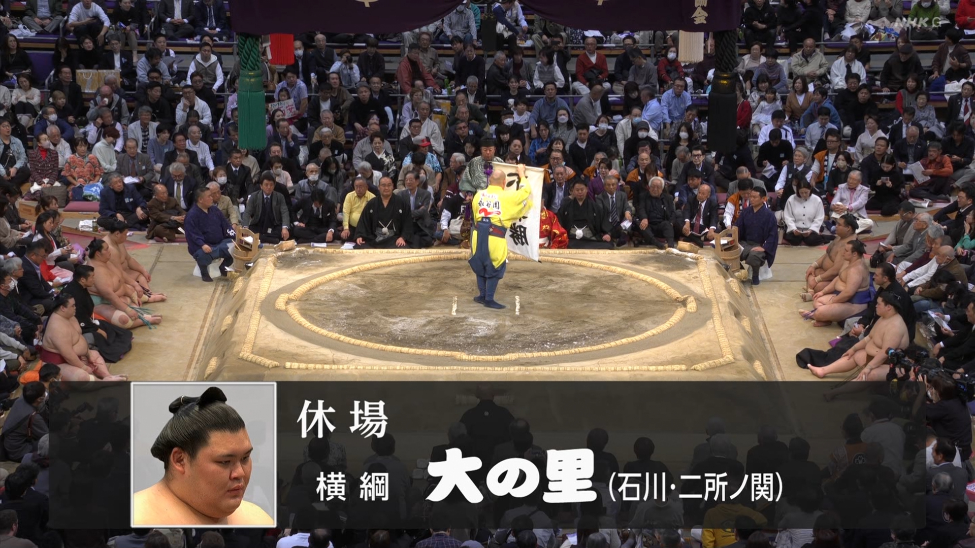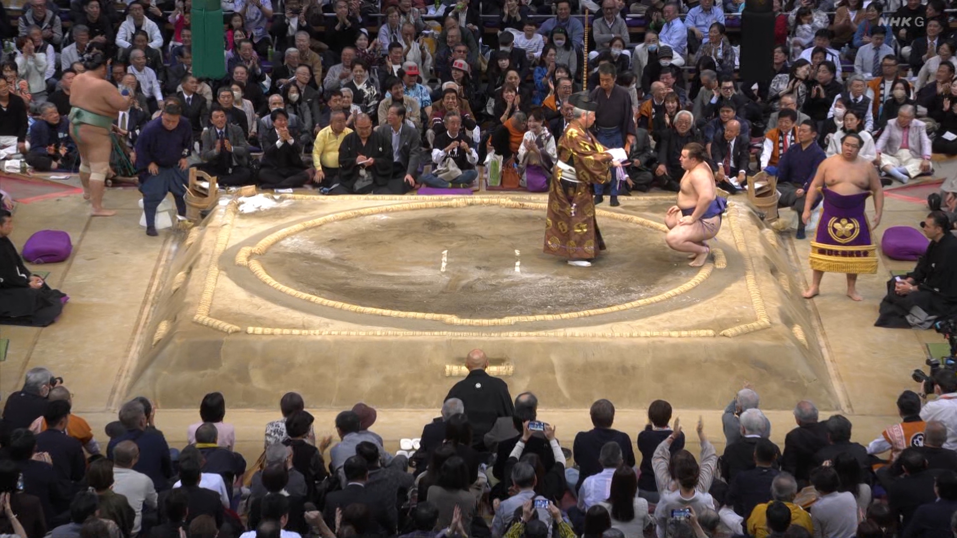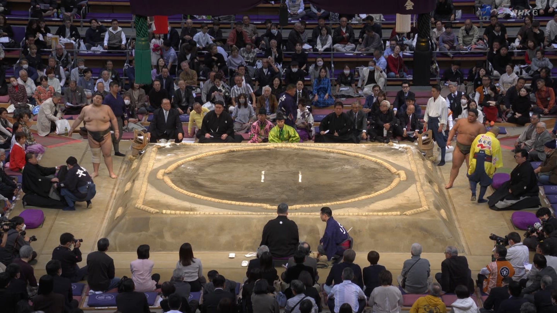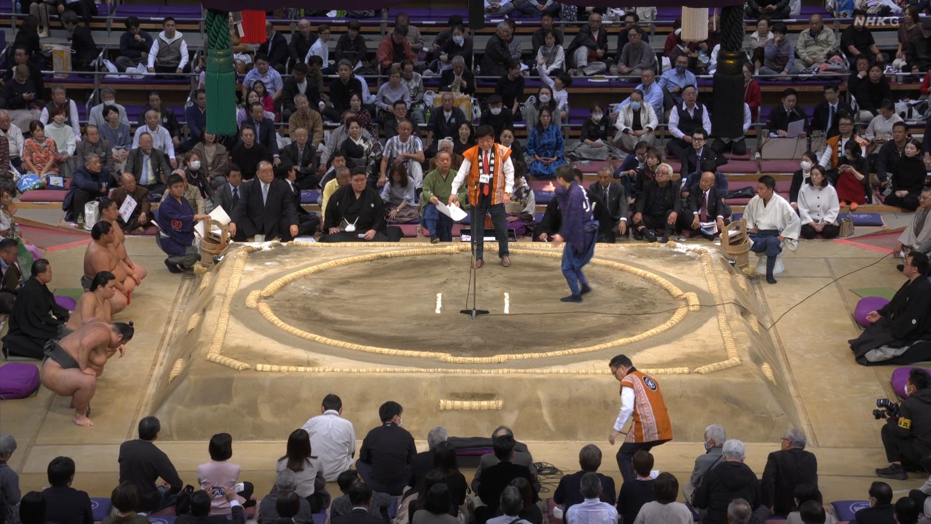【解説】正面 琴風 浩一〔元大関〕、向正面 舞の海 秀平〔元小結〕