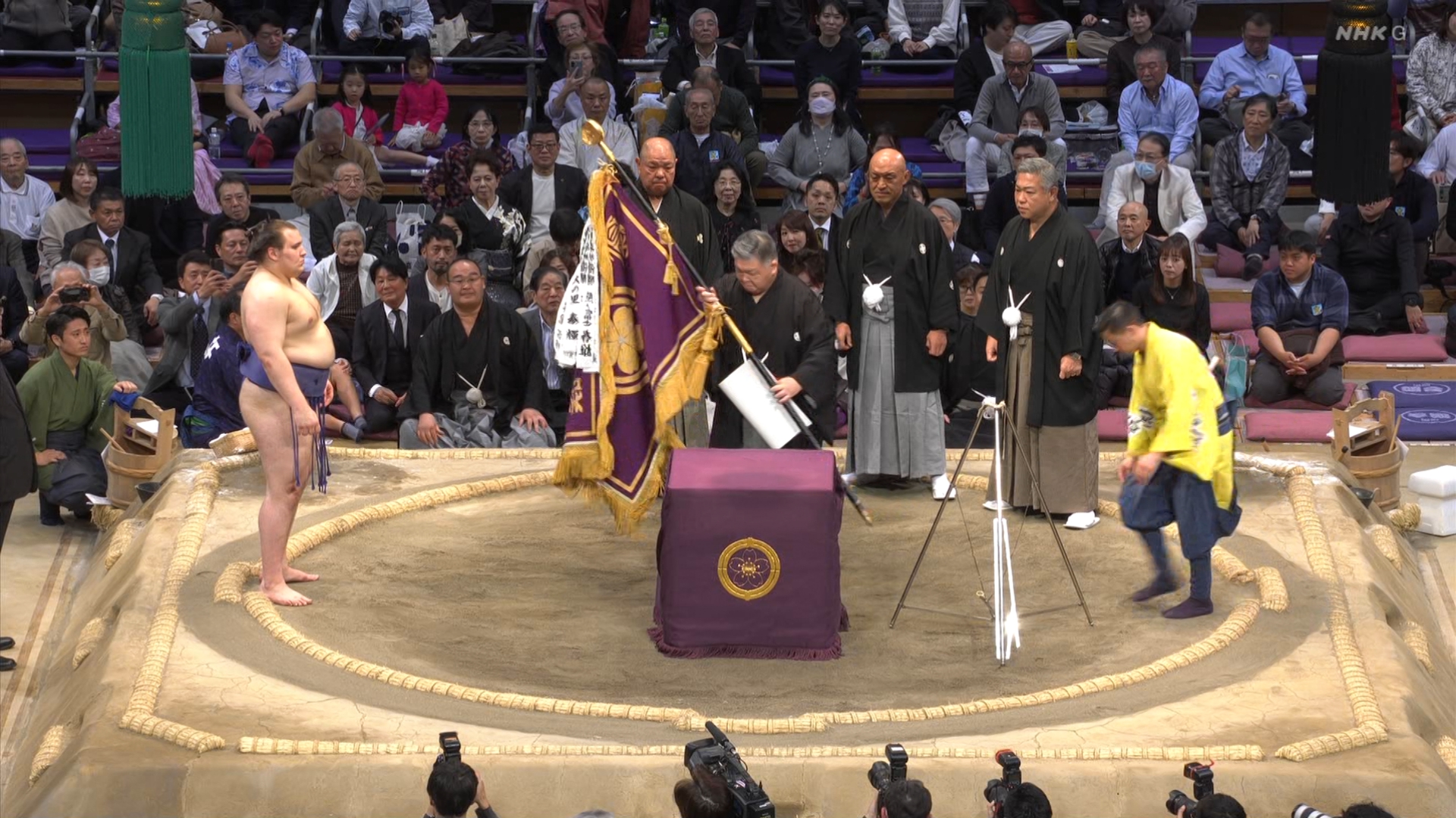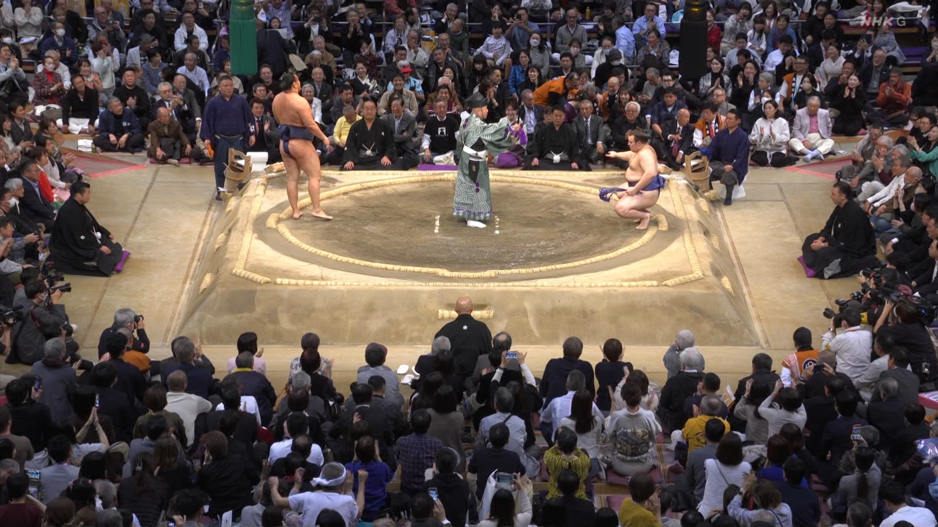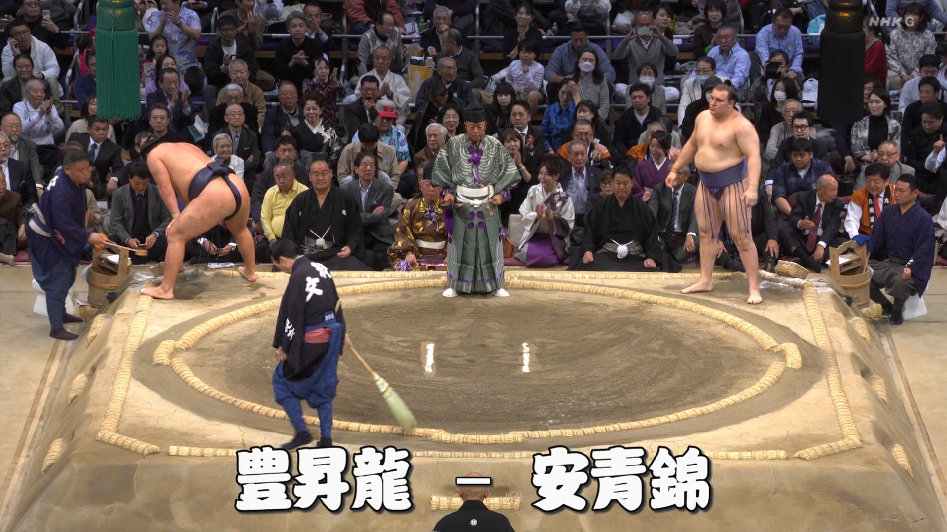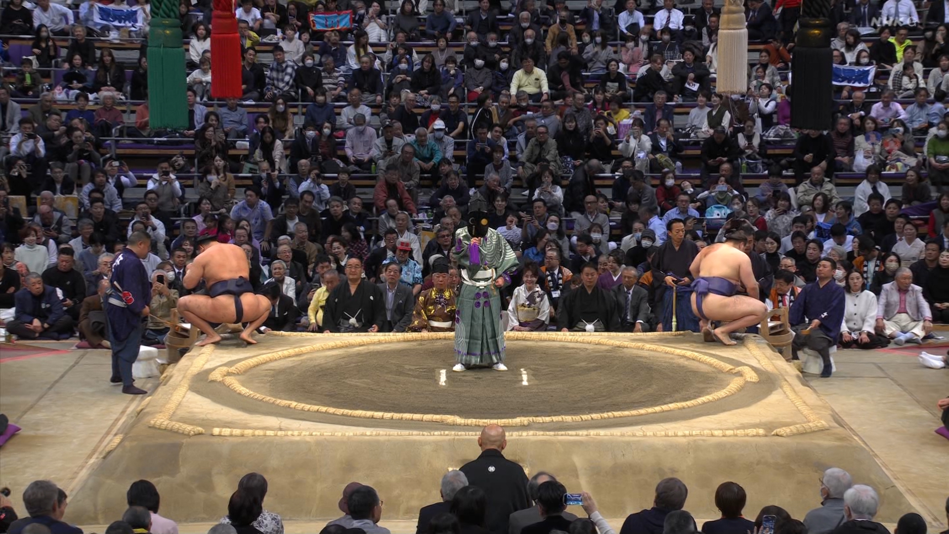 【解説】正面 琴風 浩一〔元大関〕、向正面 舞の海 秀平〔元小結〕