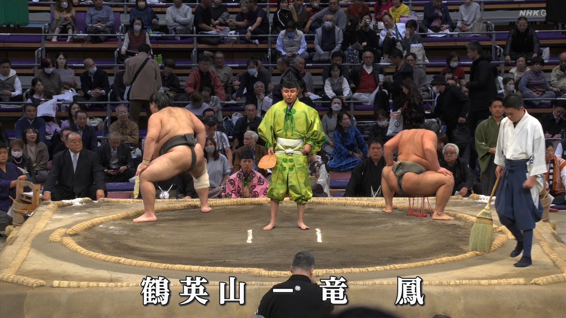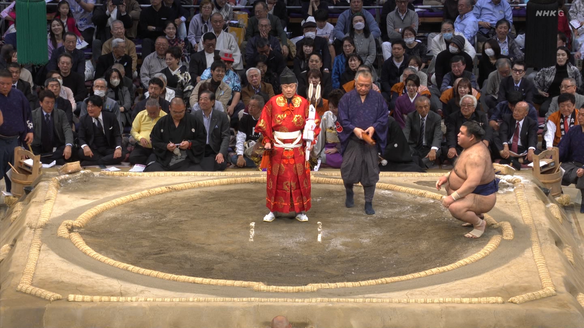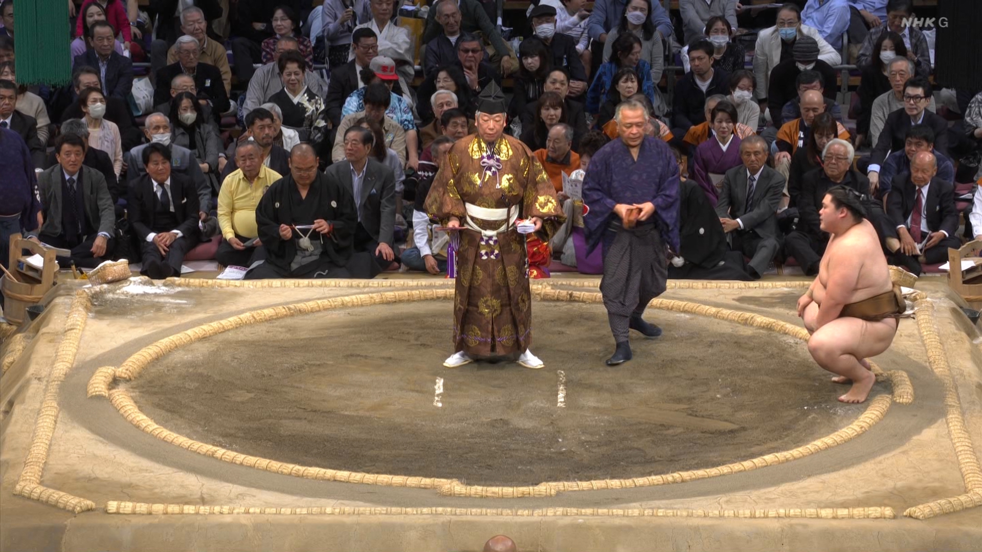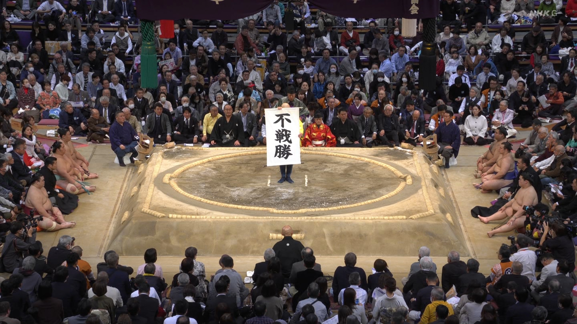 【解説】正面 琴風 浩一〔元大関〕、向正面 舞の海 秀平〔元小結〕