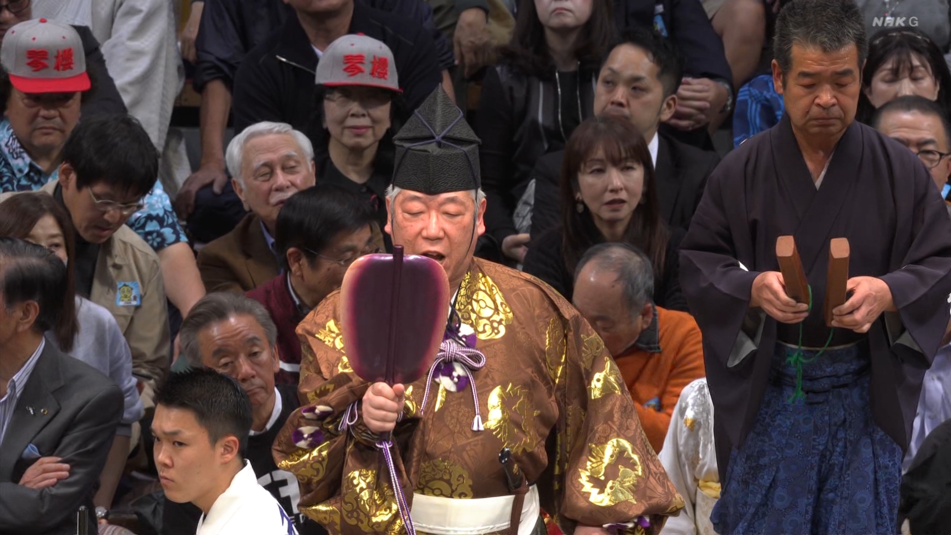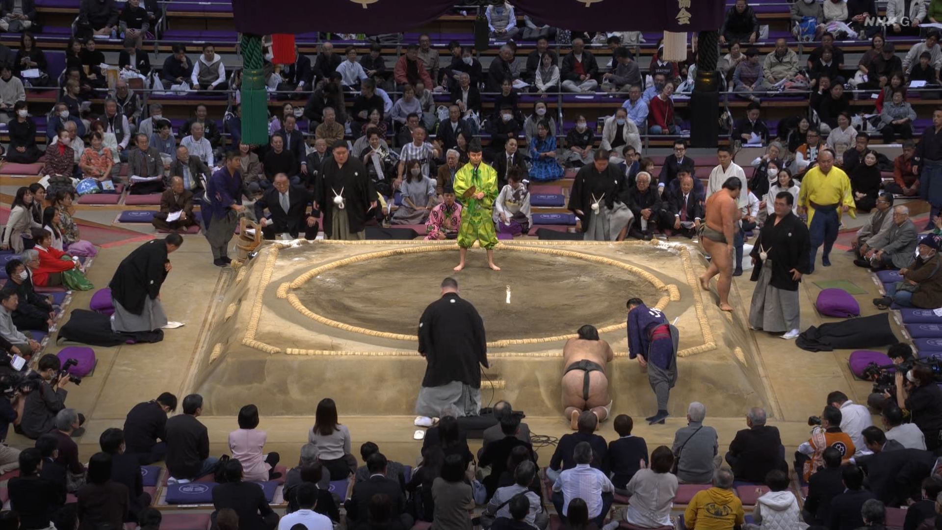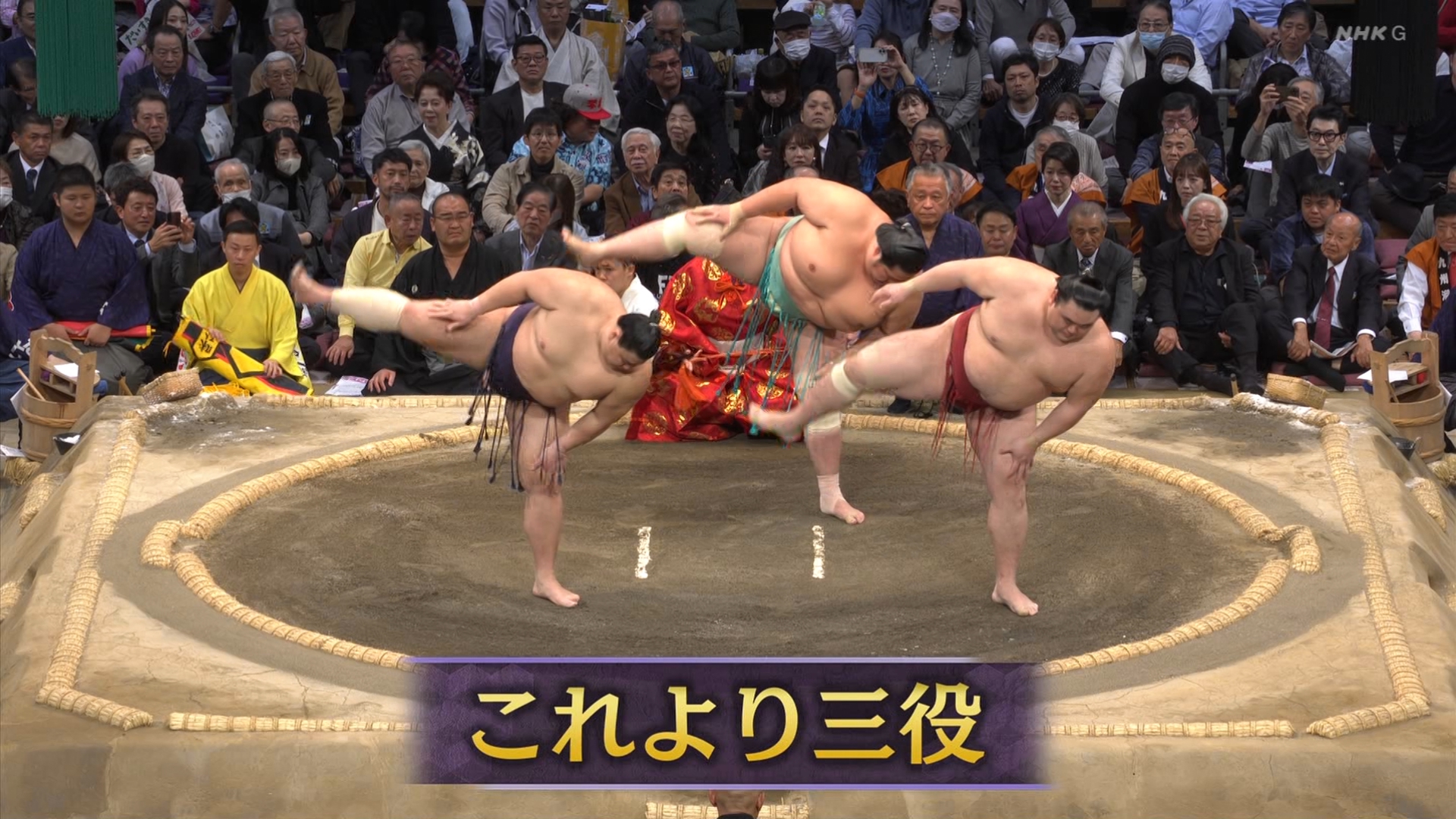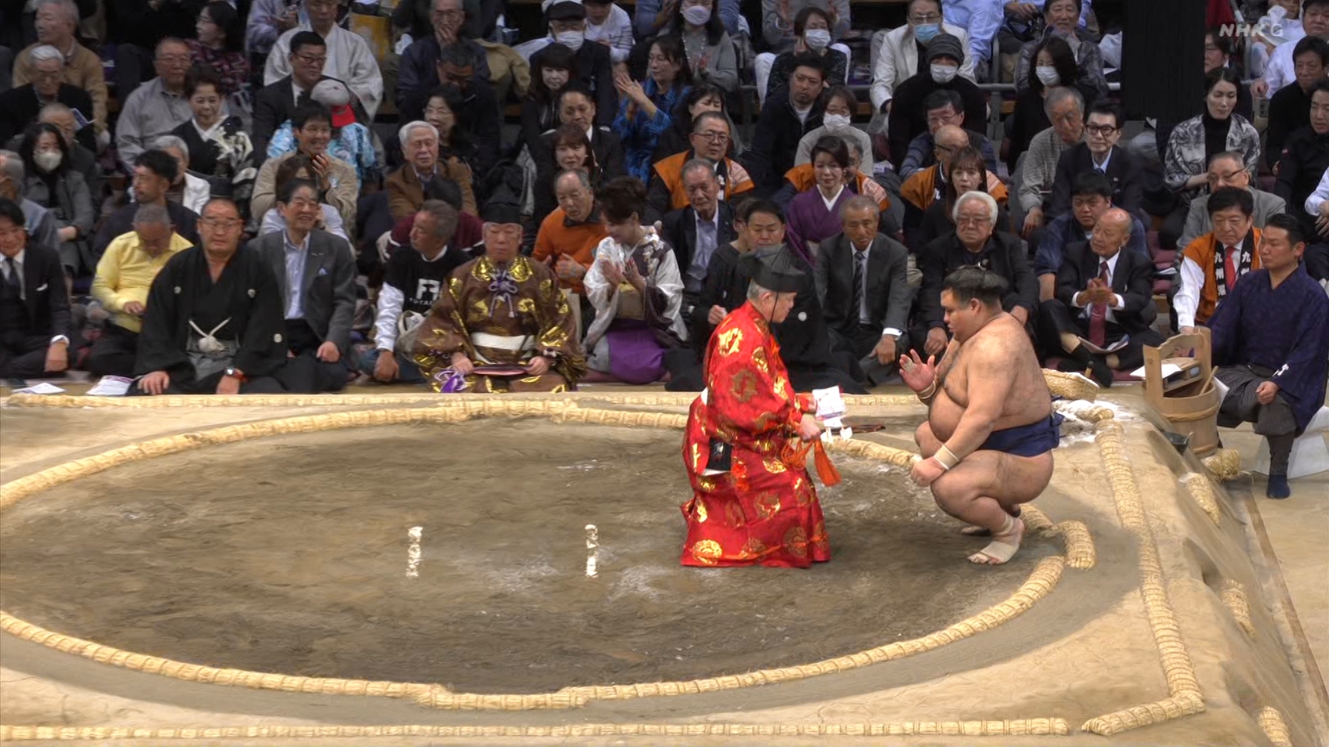 【解説】正面 琴風 浩一〔元大関〕、向正面 舞の海 秀平〔元小結〕