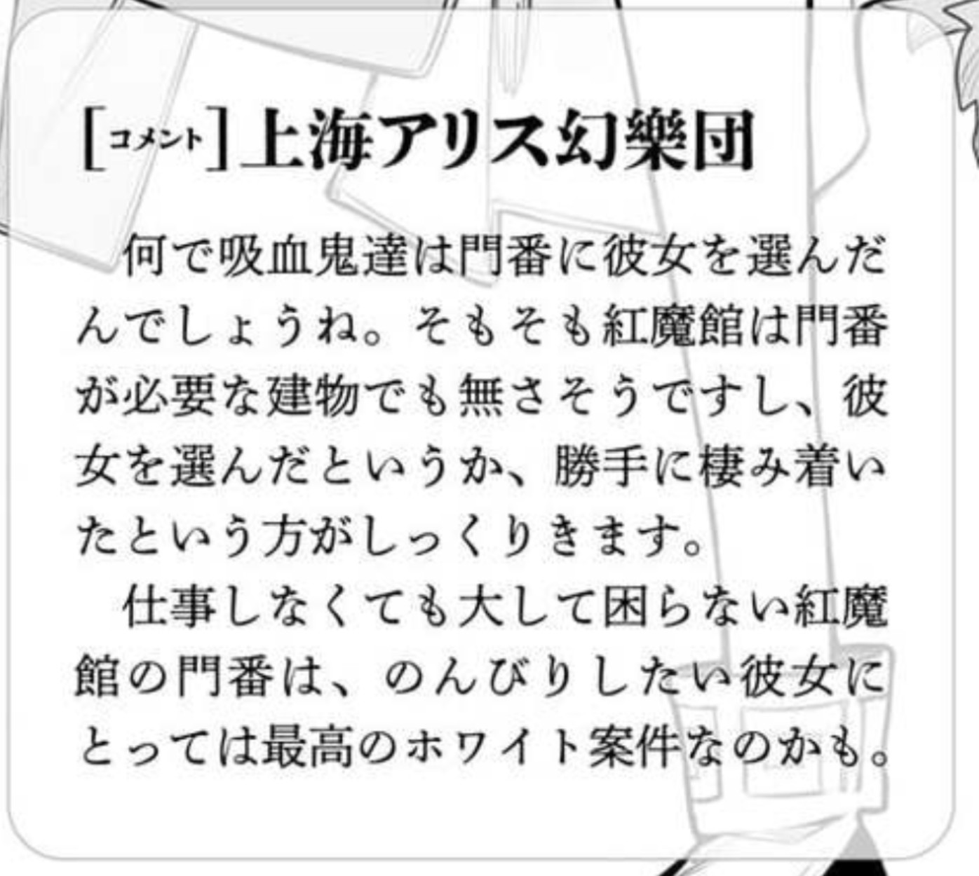 | … | 29無題Nameとしあき 26/04/02(木)11:23:05No.18219534+確か衣玖さんが「あなたの主人は強い門番を求めてあなたを雇ってるわけじゃないと思いますけどー(意訳)」 |