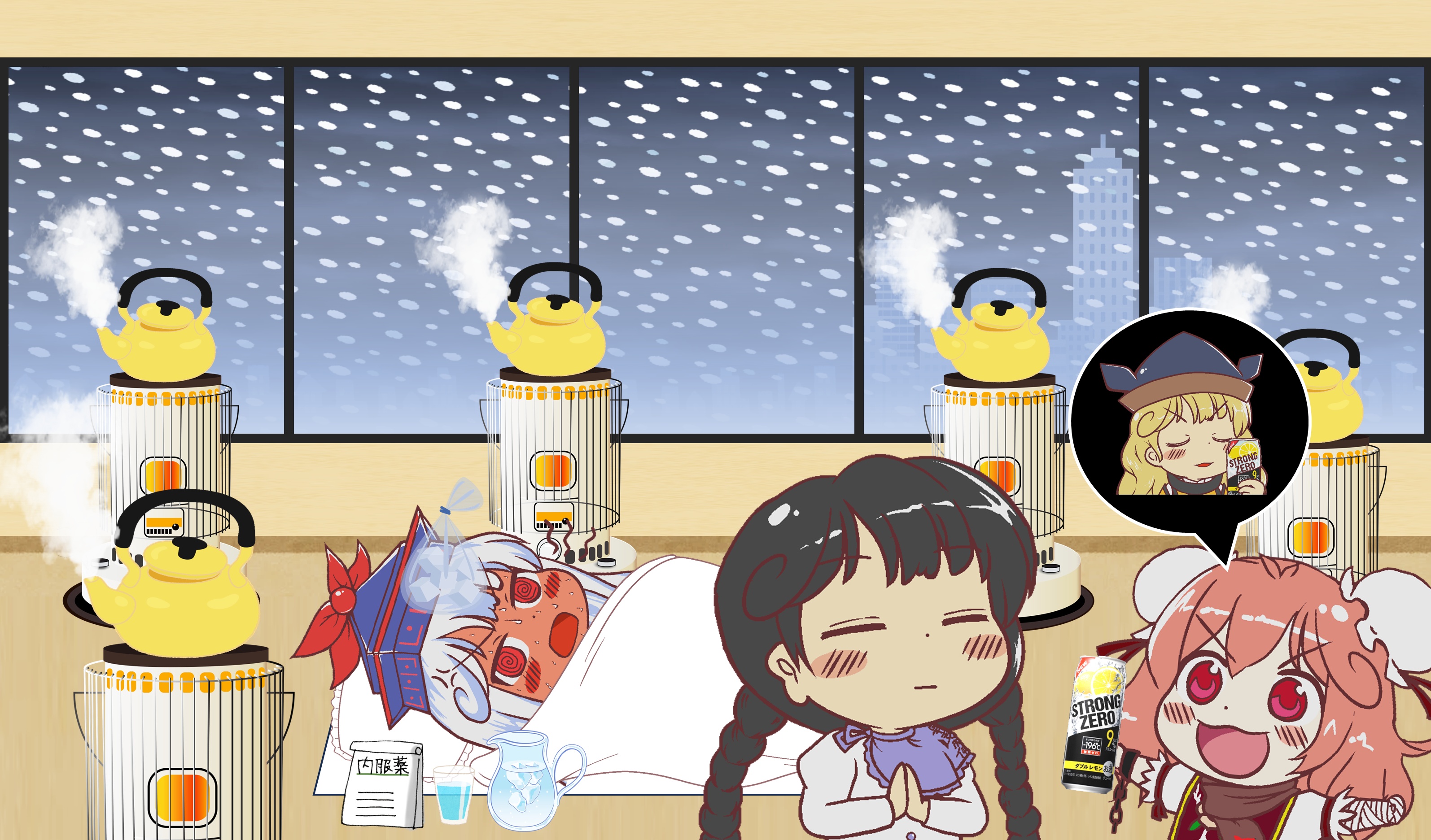 しかしそこで見たものは複数のストーブに囲まれ額に氷嚢を乗せ布団を被り震える慧音先生の姿でした