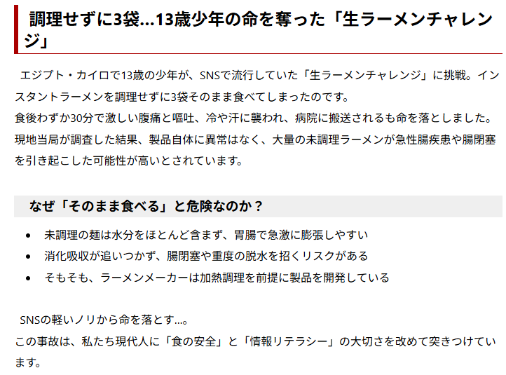 … | 11無題Nameとしあき 25/10/21(火)21:51:24No.17993178+>インスタント麺をお湯に浸けずに食べると命に関わるのか? |