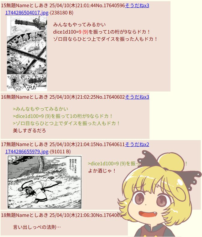 | … | 65無題Nameとしあき 26/04/07(火)22:51:00No.18226557そうだねx6 1775569860880.png-(850679 B) >>1と100が出たらそのレスの前3人もドカ! |