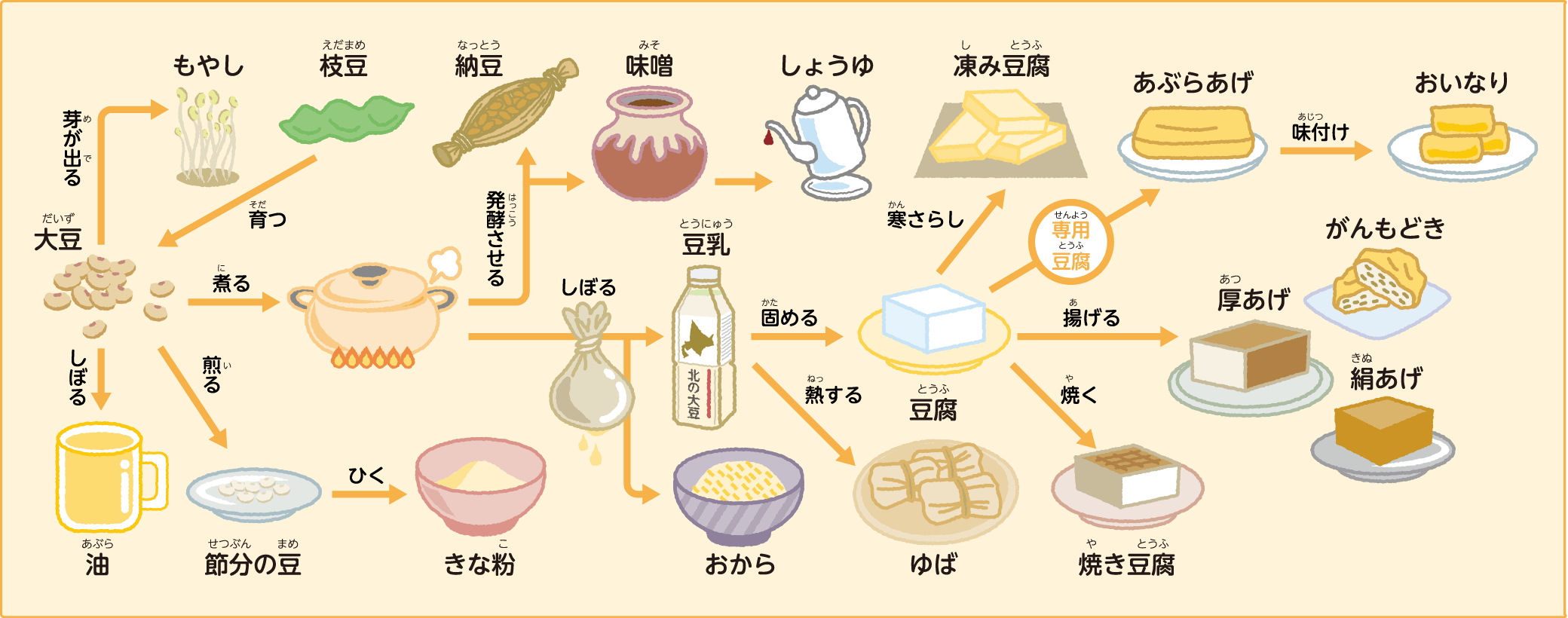 豆腐と油揚げと味噌は大豆からできている