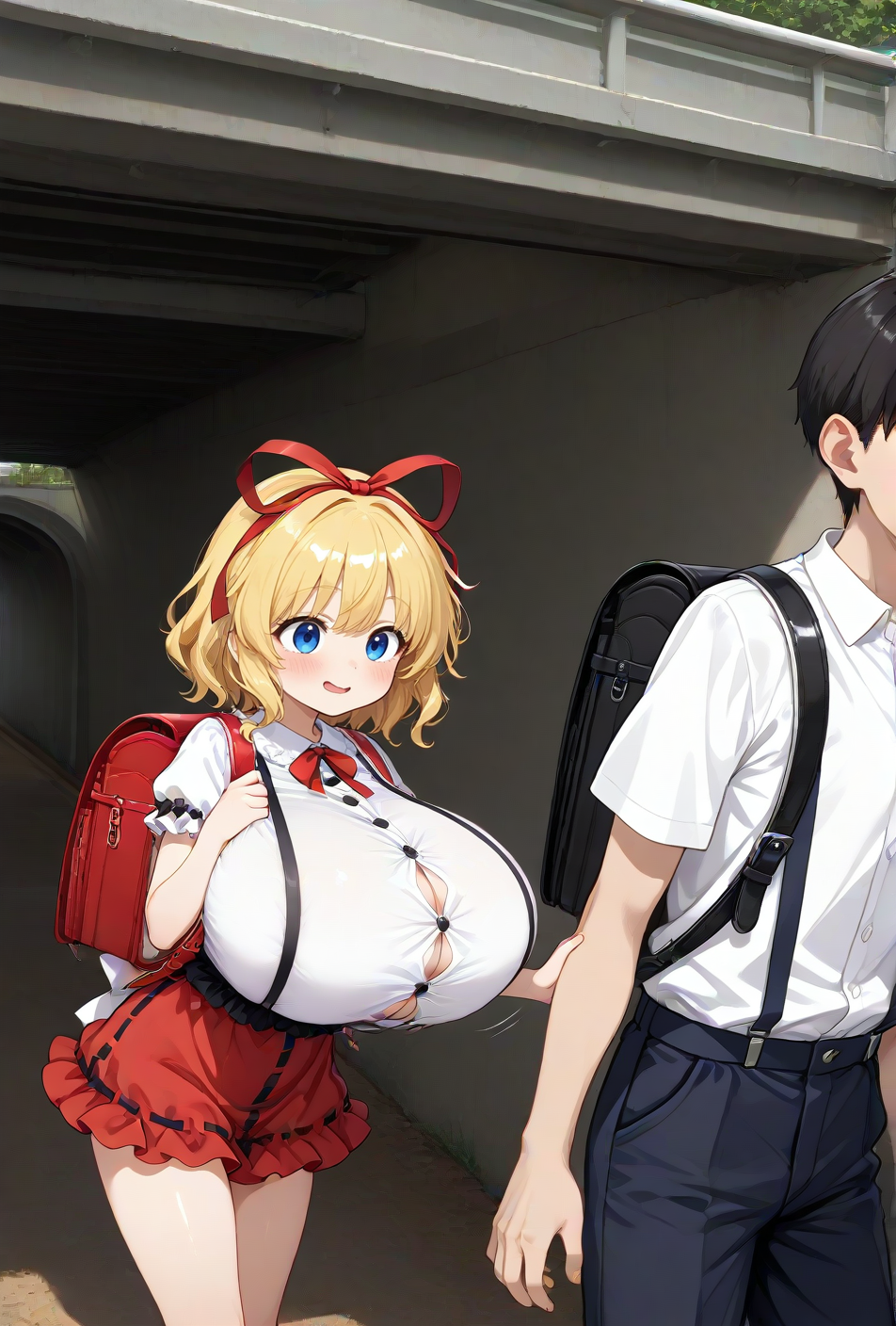 白い半袖シャツ+ミニの赤吊りスカート+赤いランドセルの小学生メディスンと河原の高架下で下校中の寄り道シチュ