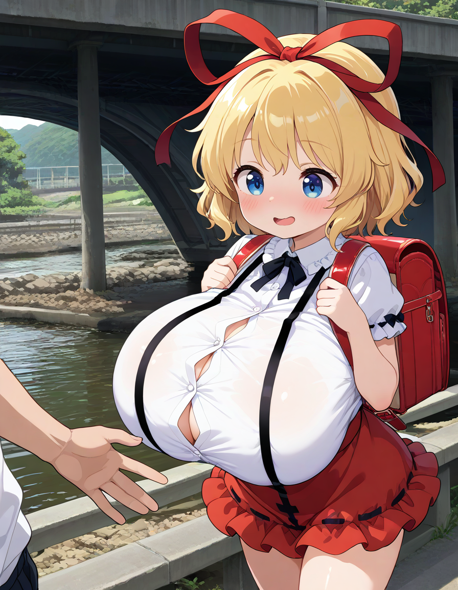>白い半袖シャツ+ミニの赤吊りスカート+赤いランドセルの小学生メディスンと河原の高架下で下校中の寄り道シチュ