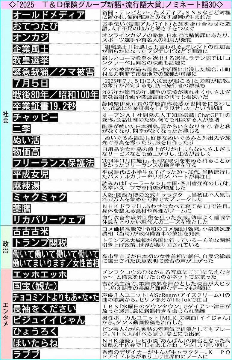 今年1年を代表する言葉を選ぶ年末恒例「現代用語の基礎知識選 2025 T&D保険グループ新語・流行語大賞」のトップテンと年間大賞が1日、発表され、年間大賞に、女性初の内閣総理大臣となった高市早苗首相(64)の「働いて働いて働いて働いて働いてまいります/女性首相」が選ばれた。レス30件省略。全て読むには返信ボタンを押してください。