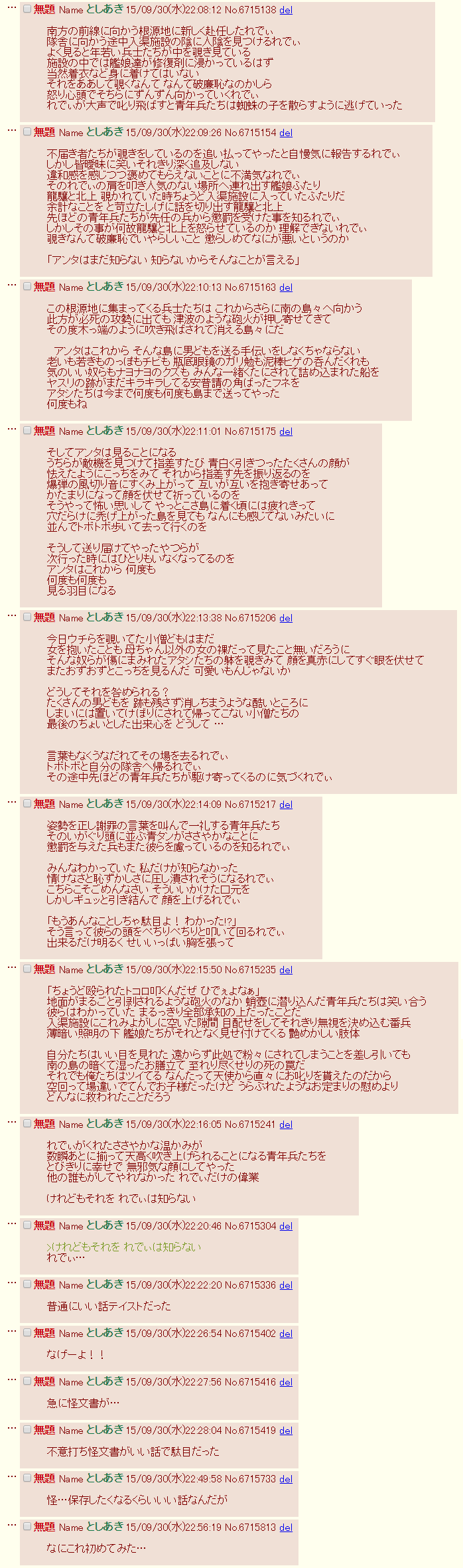 | … | 30無題Nameとしあき 26/02/01(日)02:13:01No.25447909そうだねx1暁が艦娘の風呂を覗いた若い兵士を叱る話が忘れられない |