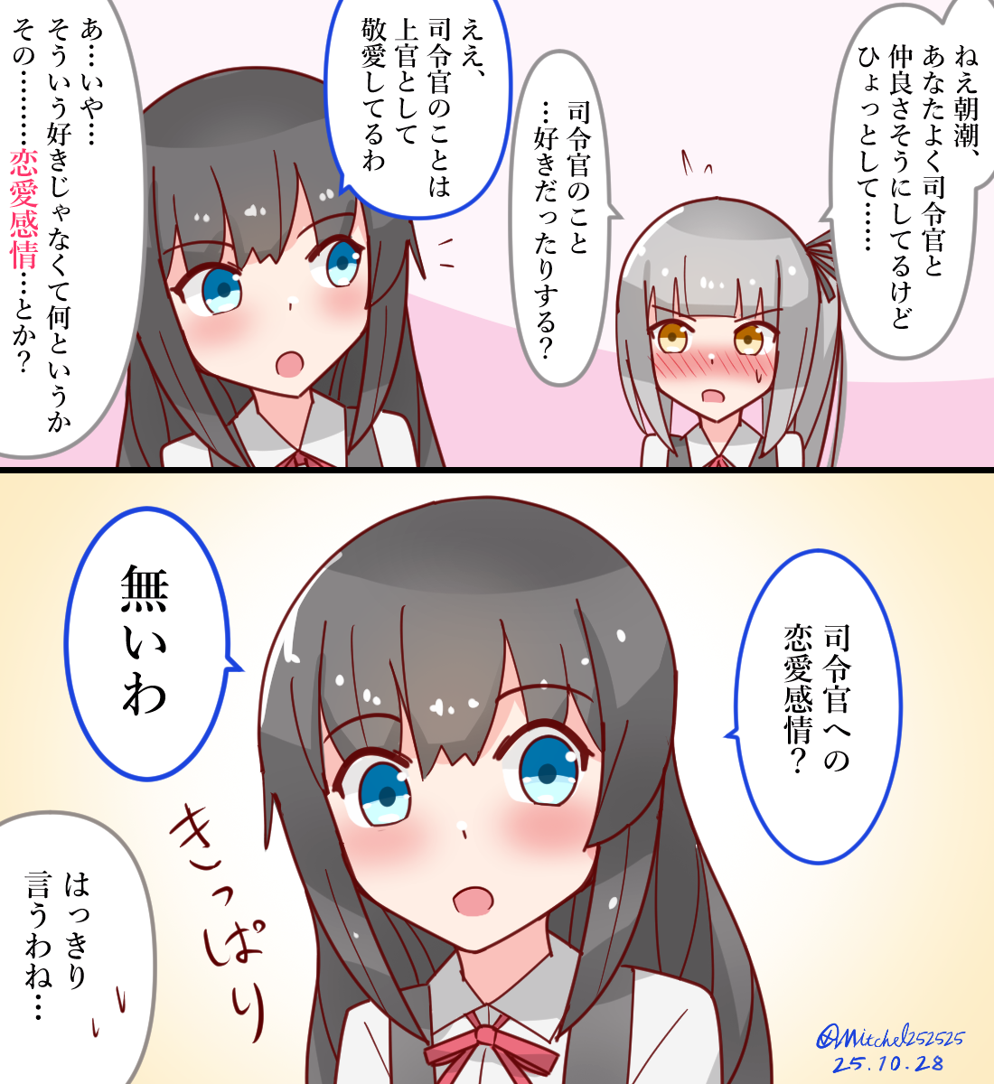 | … | 45無題Nameとしあき 25/12/17(水)12:49:38No.25384855+>>忠誠心は高いけど恋愛感情は0な朝潮というポピュラーな概念 |