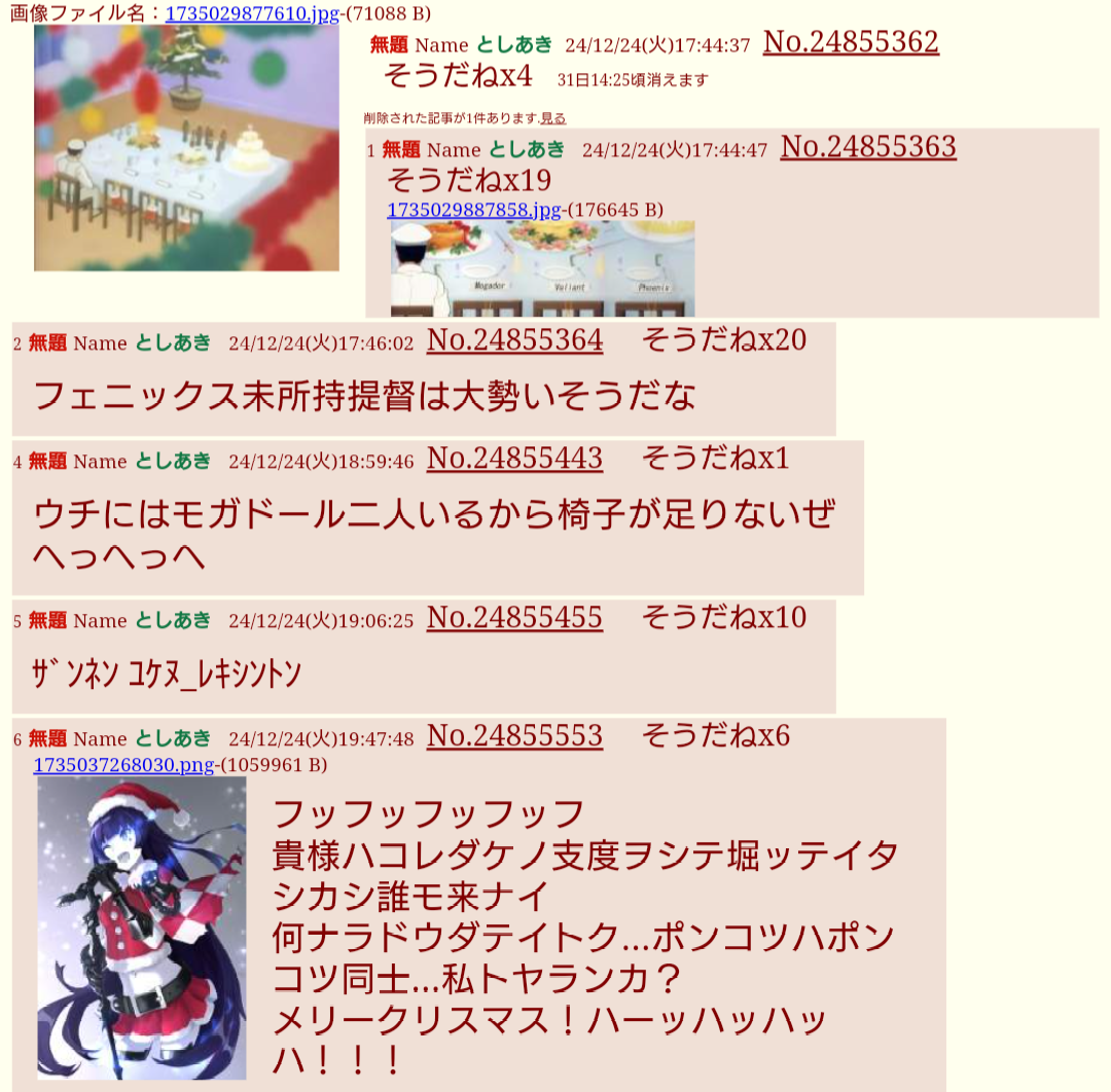 | … | 25無題Nameとしあき 25/12/25(木)10:26:17No.25397450そうだねx112駆の姉妹が来ずに荒れる叢雲の画像もあったが |