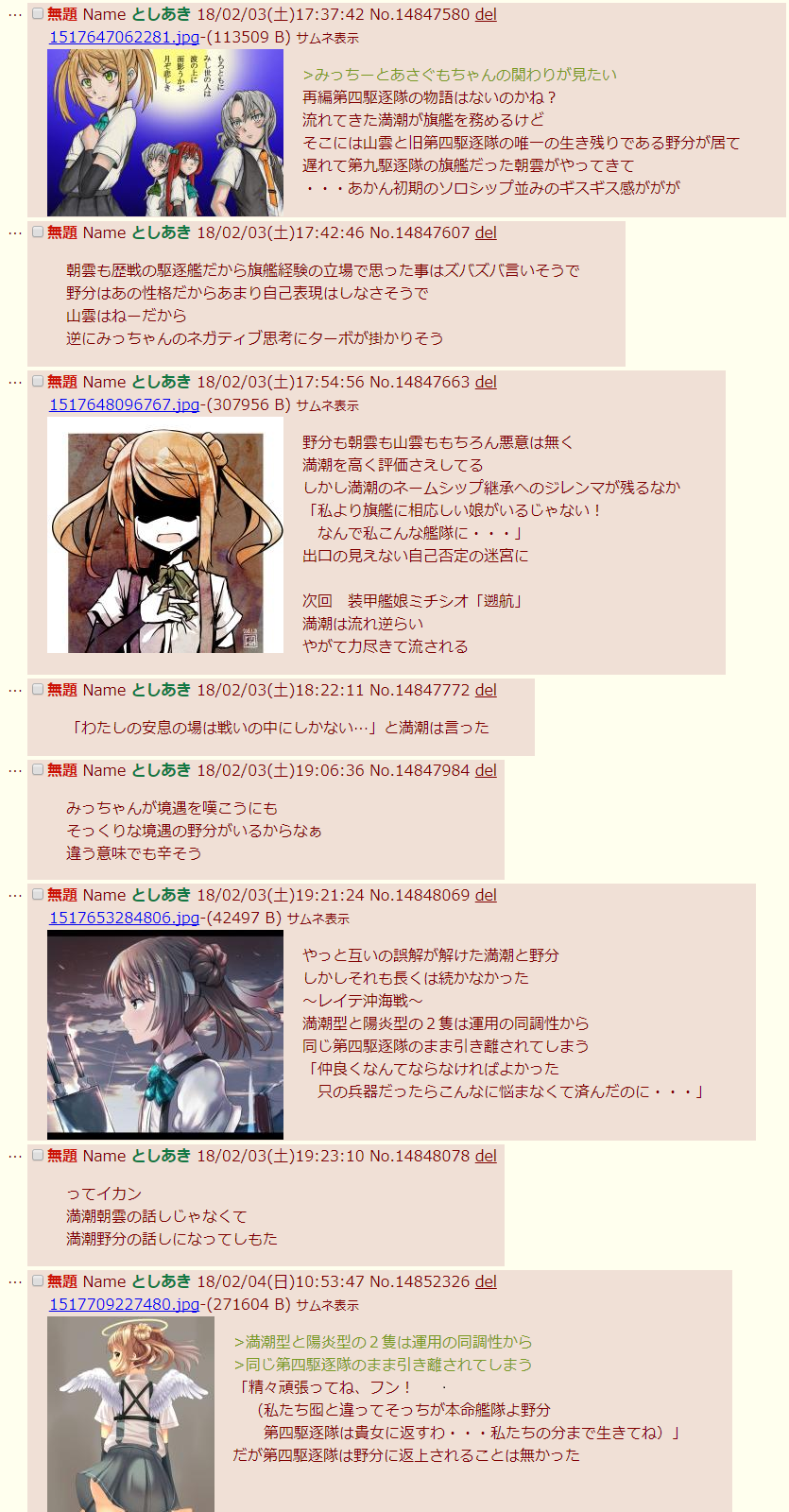 | … | 90無題Nameとしあき 26/03/16(月)23:31:40No.25500124そうだねx3 1773671500928.jpg-(163014 B) >自身の弱さから逃げる満潮と弱さを押し殺して無理矢理にでも自身を奮い立させる朝雲 |