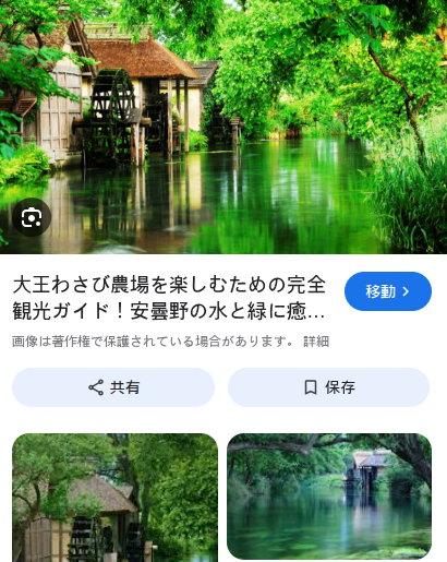 | … | 10無題Name名無し 26/03/10(火)20:40:42No.10464+長野県安曇野市の「大王わさび農場」周辺では、秋(10月〜11月頃)にマツタケ狩りやマツタケ料理を楽しむツアーが開催されることがあります。また、農場周辺の松林エリアは、信州の秋の味覚である松茸の産地としても知られています。大王わさび農場は、日本最大級の広さを誇るわさび農場です |