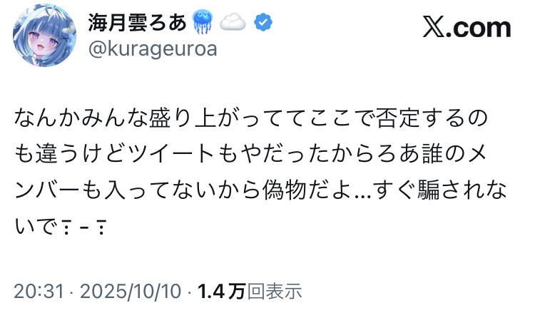 … | 105無題Name名無し 25/10/10(金)21:20:13 IP:147.192.*(nuro.jp)No.1898281そうだねx1まあ…わかりやすく活動用のアカウントで入ることはないだろう |