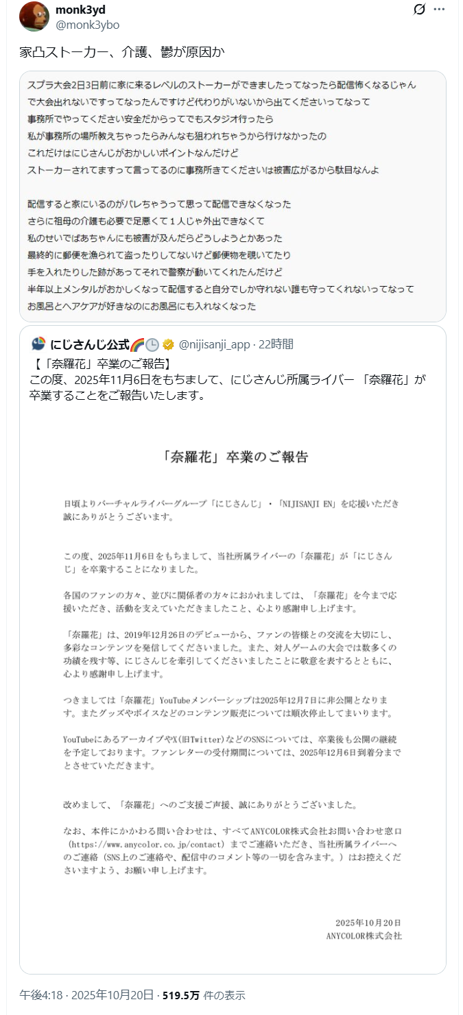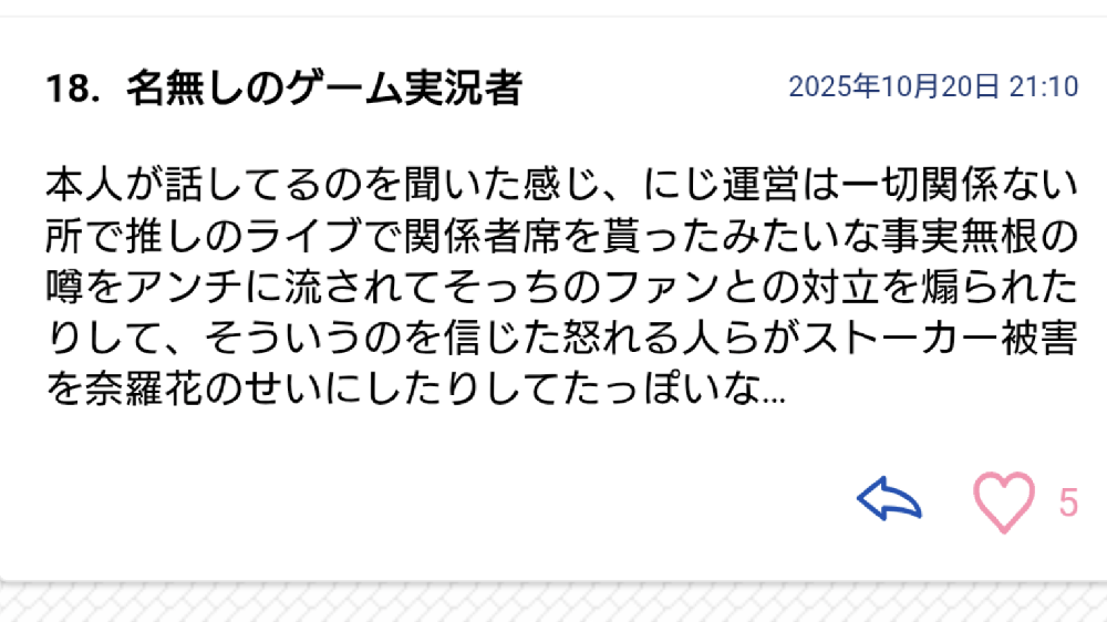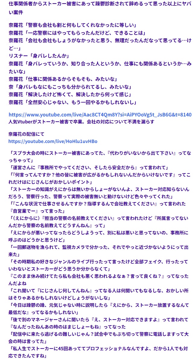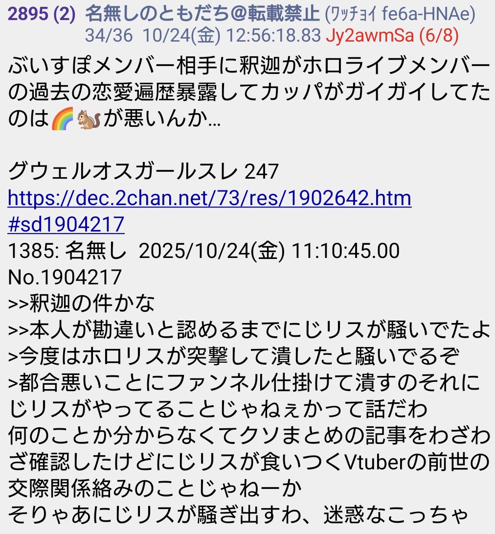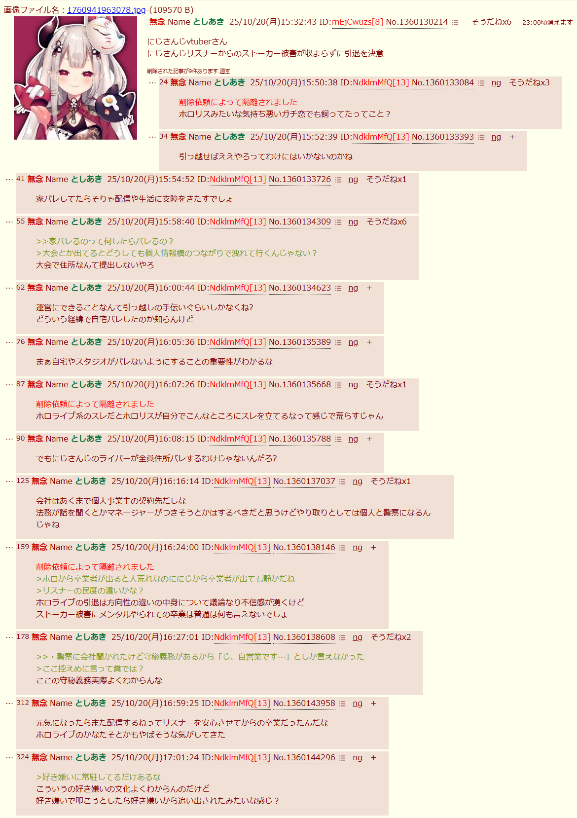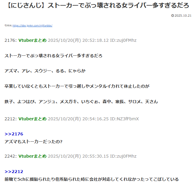 | … | 42無題Name名無し 25/10/20(月)19:59:34No.1902690そうだねx12仕事に関わってる奴がストーカーしてるなら他のライバーも危ないだろ… |