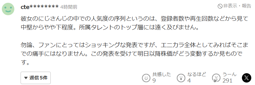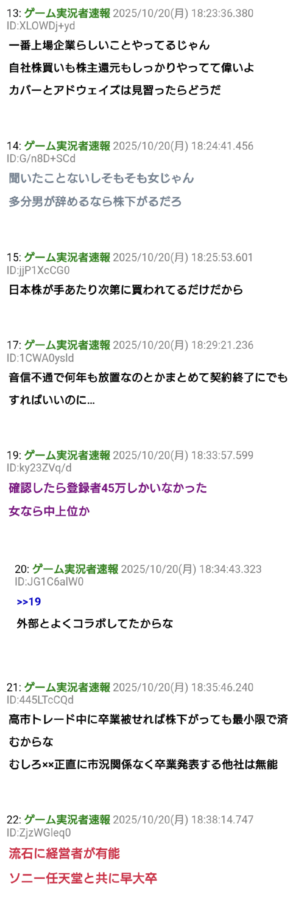 | … | 59無題Name名無し 25/10/20(月)20:09:31No.1902708そうだねx2>>他社は卒業発表で一割株が下がったけどエニカラは一割上がるんだな |