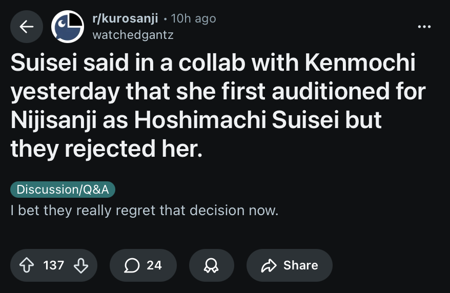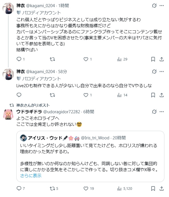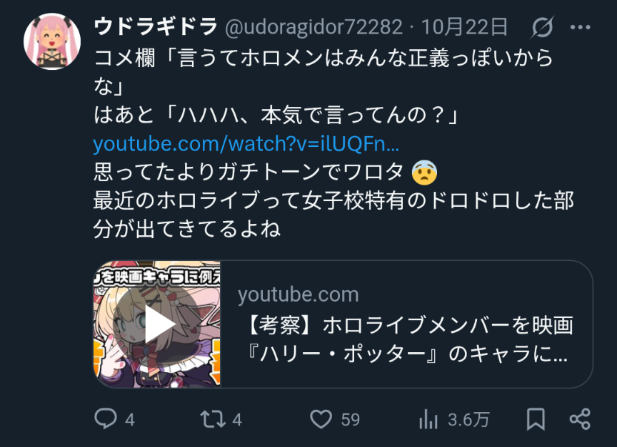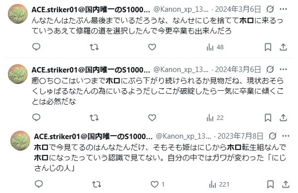 | … | 1569無題Name名無し 25/10/24(金)22:04:13No.1904427そうだねx8皮肉っぽい書き方でまるで当事者みたいににじ側の手の内を明かす奴よく湧くよね |
