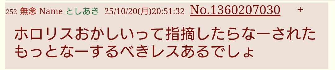 | … | 71無題Name名無し 25/10/20(月)20:14:29No.1902720+>この星街の発言の何がそこまで痴漢の逆鱗に触れたんだろうか |
