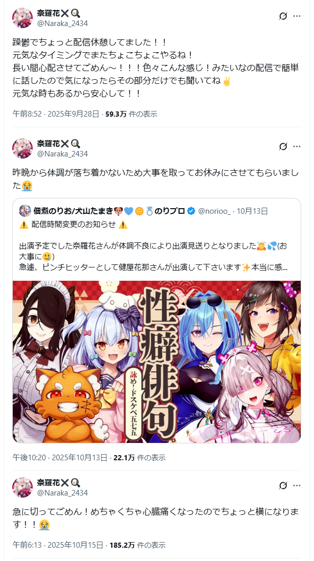 | … | 1597無題Name名無し 25/10/25(土)00:29:29No.1904460+>いいお知らせが出来そうって言ったのが15日で実際は今こうなってるってこれ15日時点だと本人卒業する気なかったんじゃ |