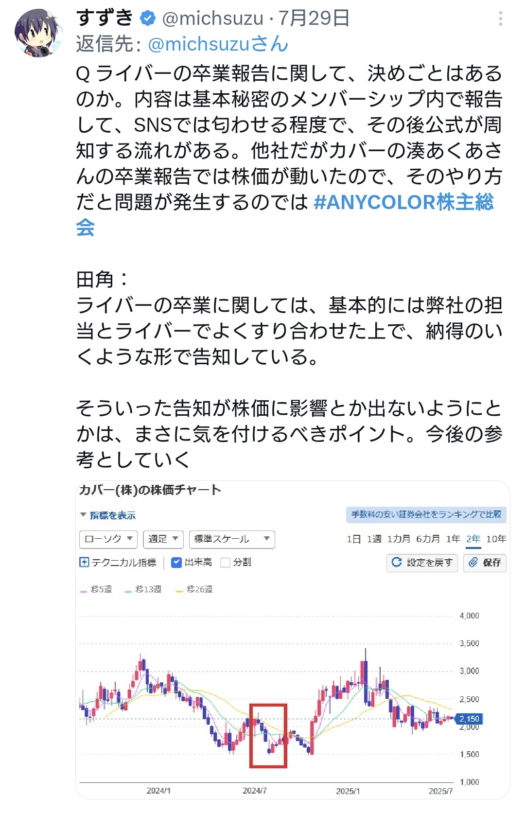 | … | 95無題Name名無し 25/10/20(月)20:22:38No.1902745そうだねx1 1760959358566.png-(209785 B) >どっかの株安無能企業と違って卒業発表で株を一割近く暴騰させる超有能企業 |